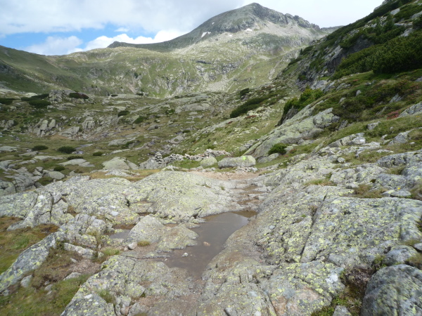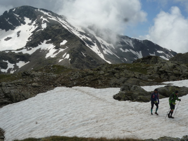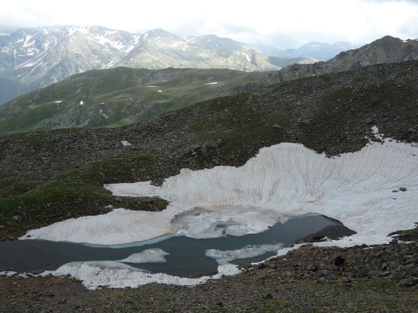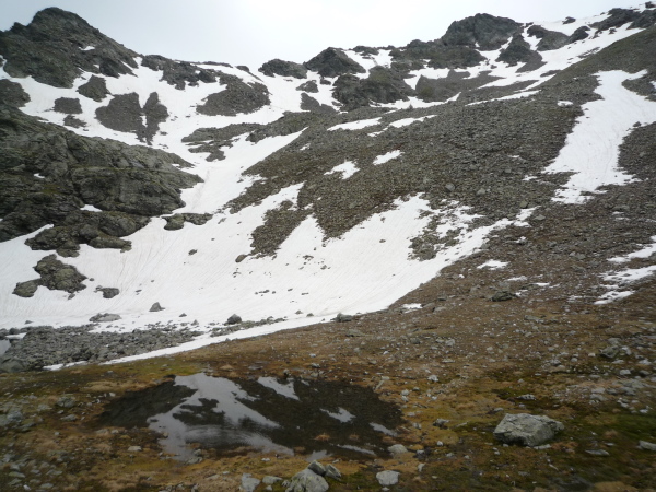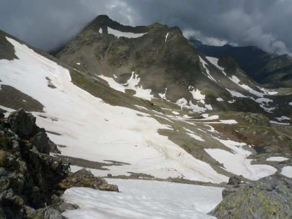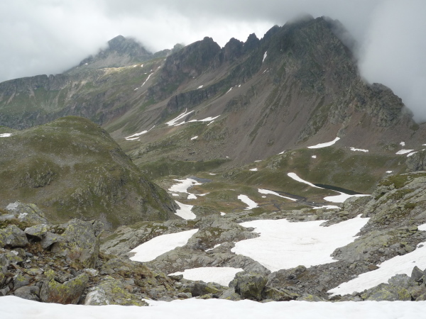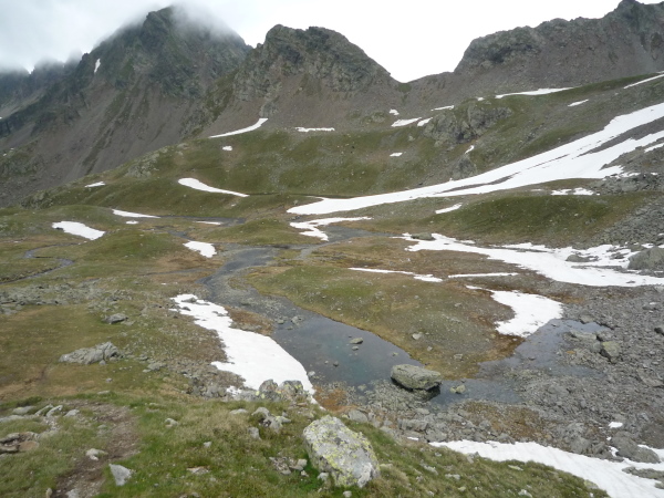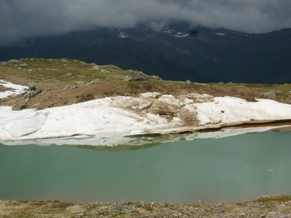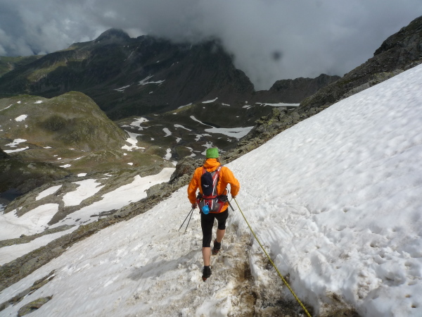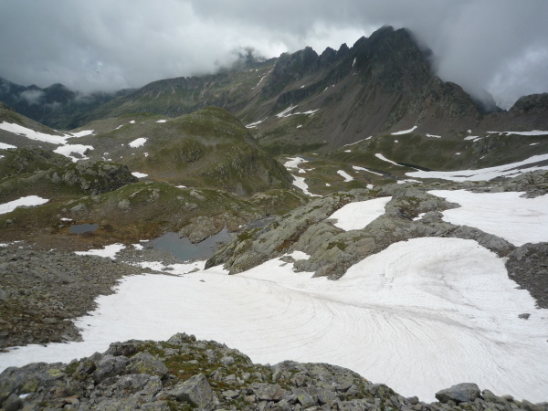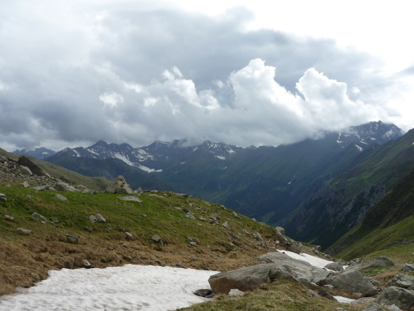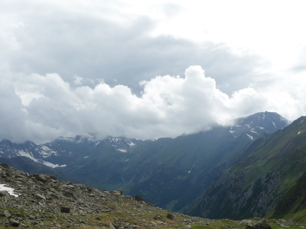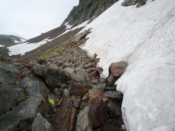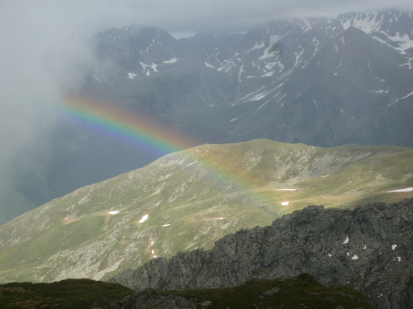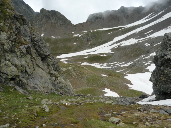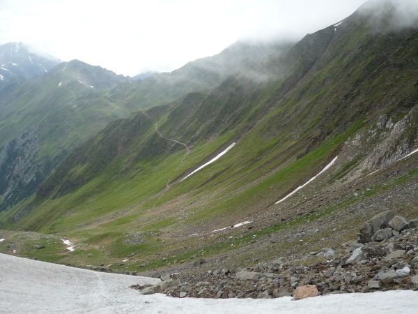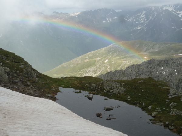 Immer tiefer dringe ich in das Tal hinein. Unwegsamer werden Landschaft und Weg, dicke Wolken wälzen sich erneut heran. Ein grandioses Naturschauspiel tut sich vor meinen Augen auf. Ein riesiger Regenbogen spannt sich über dem Tal und wird langsam von einer sich heran schiebenden Wolke „aufgefressen“. Die endlosen Grasmatten werden mit zunehmender Höhe von Geröll und Schnee abgelöst und auch der Pfad gestaltet sich entsprechend. Immer öfter muss ich die gelben Markierungen suchen. Und auf einmal ist alles nur noch schwarz-weiß. Oder genauer: schwarz-grau. Wolken und schmutziger Schnee mischen sich zu einer grauen Melange, die am Horizont kaum noch zu trennen ist. Über ein Schneefeld nach dem anderen stapfe ich, nur ab und an durchbrochen von einer Felseninsel. Ich komme mir vor wie in einer Wüste aus Schnee und Eis.