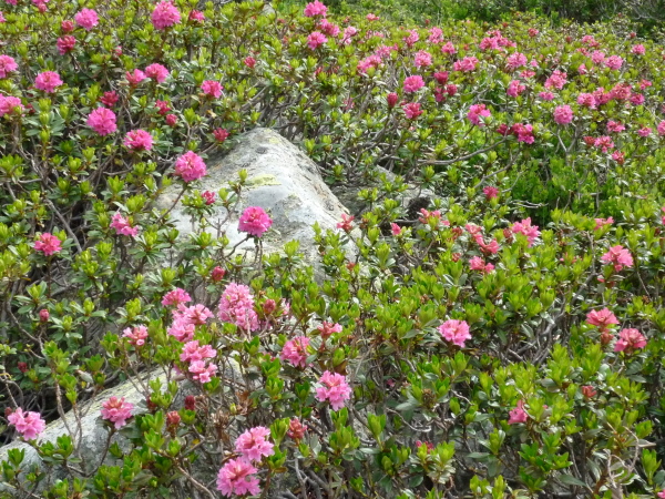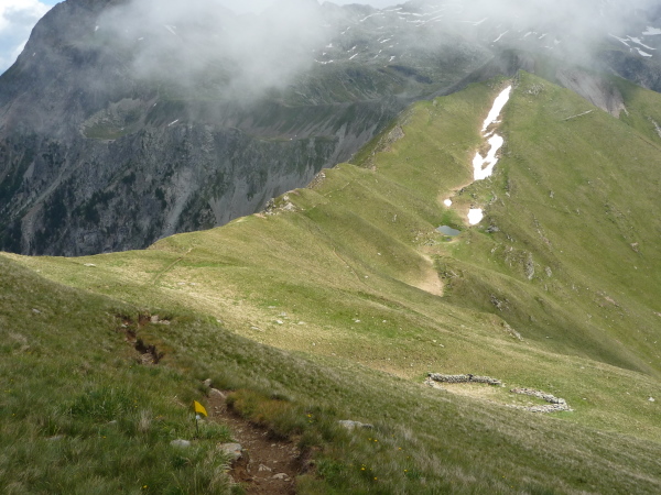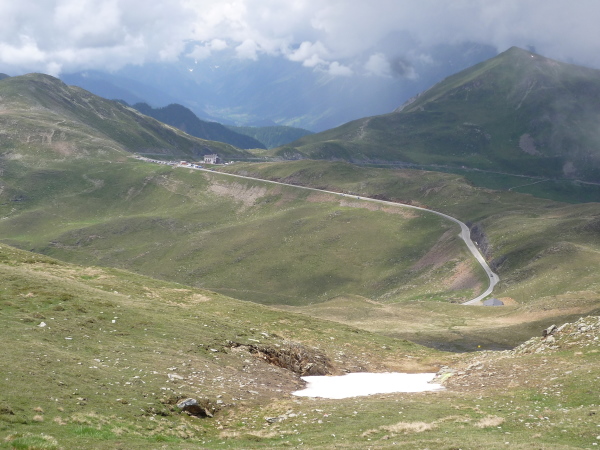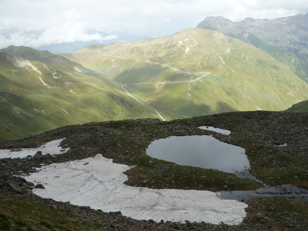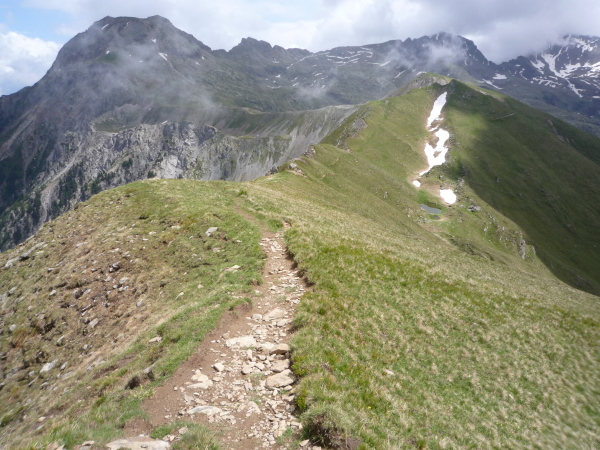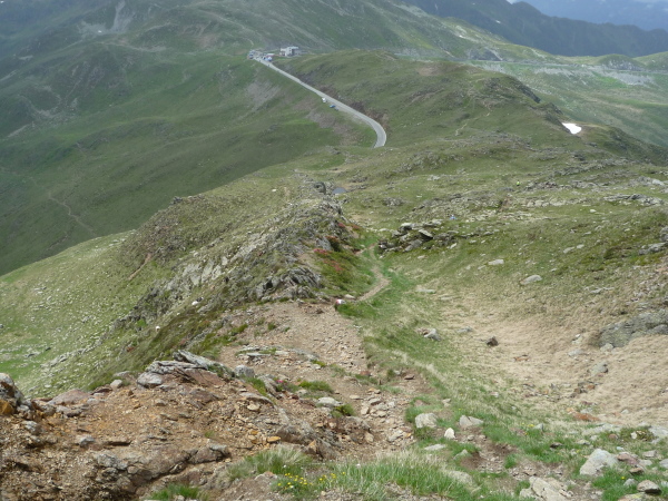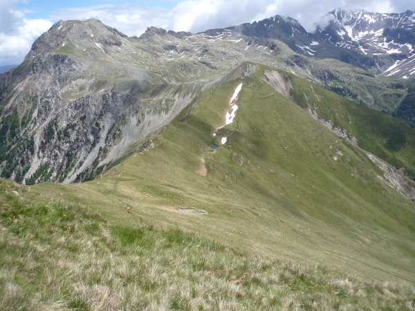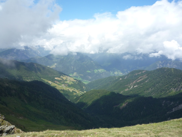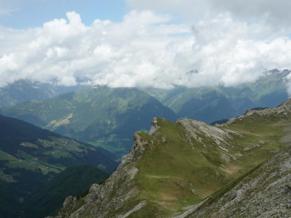 Auf und ab geht es, vor allem aber wieder rauf, kräftig rauf. Wir erreichen einen herrlichen Berggrat, von dem links und rechts der saftig grüne, baum- und strauchlose Wiesenhang steil in die Tiefe fällt. Direkt diesem Grat folgt unser Pfad. Das ständig in Bewegung befindliche Licht-Schattenspiel von Sonne und Wolken lassen mich die Landschaft ständig neu erleben. Bis hinauf zum Astenberg führt der Pfad. Von hier ist unser nächstes Zwischenziel schon gut auszumachen: Das Penser Joch (2.211 m üNN) mit dem einsam auf der Passhöhe residierenden Alpenrosenhof. An der Passhöhe endet das Sarntal, dahinter beginnt das Wipptal. Vom schmalen Band der Passstraße höre ich selbst aus der Ferne das Röhren schwerer Motorräder empor schallen. Doch der Straße bleiben wir fern und schleichen uns auf einem Pfad von hinten an die Passhöhe heran.
