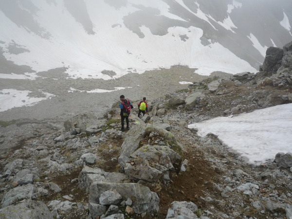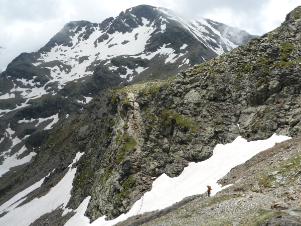 Der Weg flacht ein wenig ab. Eine tolle Umgebung muss das hier sein, aber leider kann ich die Wildheit der Berglandschaft nur anhand dessen erahnen, was die Lichtkegel erfassen. Die flache Passage gewährt nur eine Verschnaufpause. Schon geht es über den Grat auf ein Neues steil nach oben. Nochmals schrammen wir die 2.500 m-Grenze, nur um uns sogleich erneut einer rasanten Hanglage bergab stellen zu müssen.