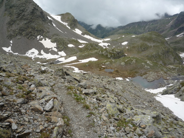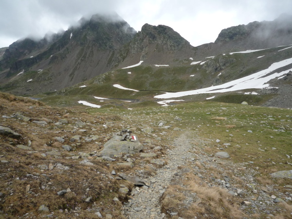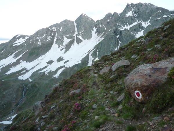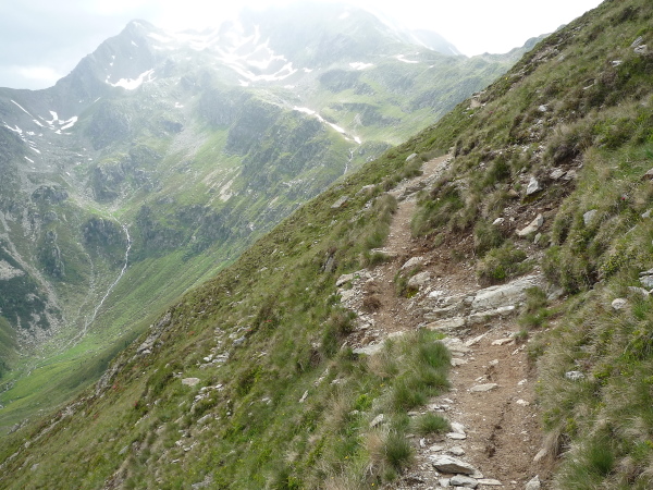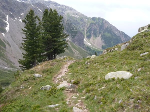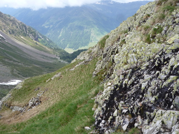 Ich bin so von der Landschaft gefangen, dass ich keinen Gedanken an die Markierungen verschwende. Und schon ist es passiert. Mal wieder. So kann man natürlich auch seine Zeit vertun. Ein Stück weit zurück finde ich den verpassten Abzweig zum Penser Joch. Und folge dem durch die Flanke des Hanges aus dem Talboden hinaus führenden Pfad.