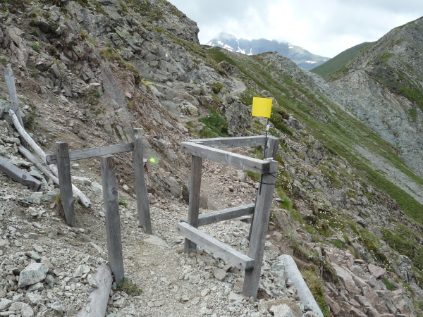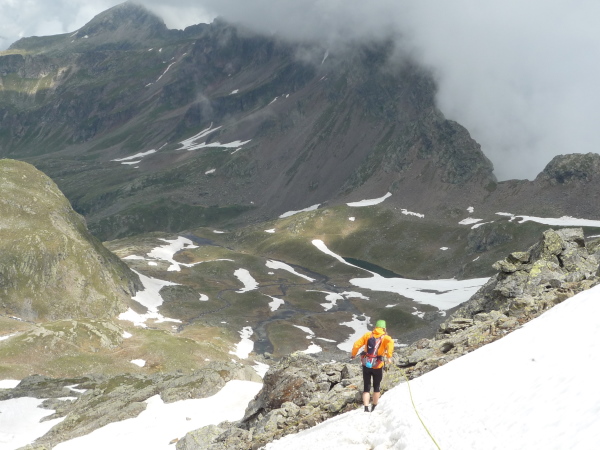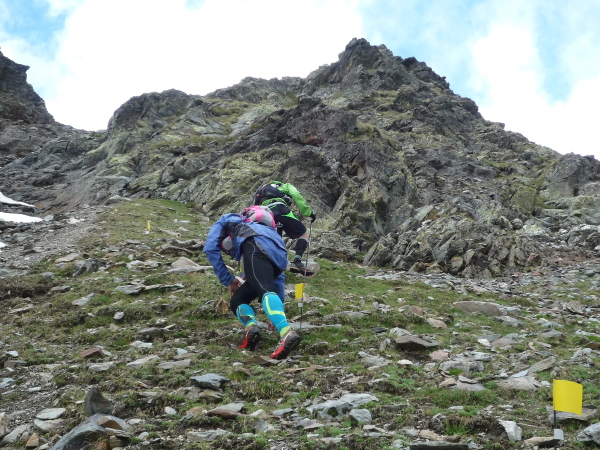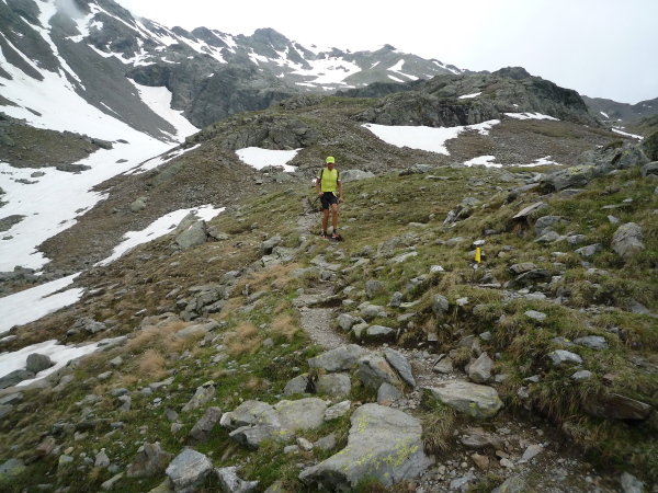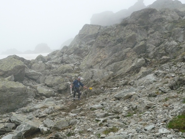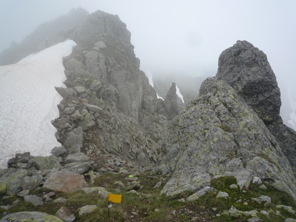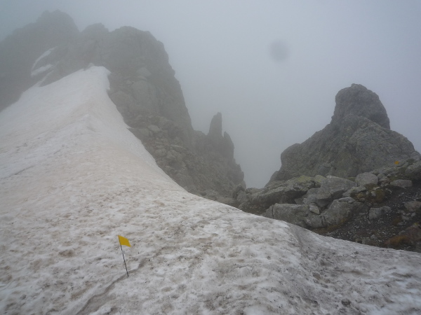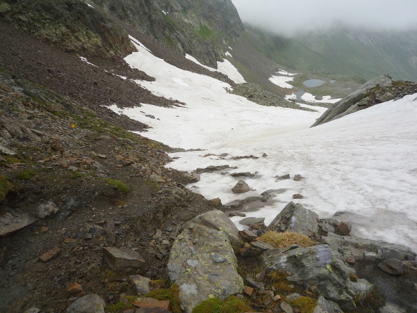 Die gelben Fähnchen dirigieren meinen Weg bis zu einer Abbruchkante, hinter der bizarre Felstürme in den Wolkennebel ragen. Ich habe das sogenannte Gerölljoch, 2.500 m hoch bei km 64 gelegen, erreicht. Ungläubig schaue ich in die Tiefe. Da soll ich runter? Ich habe doch keinen Fallschirm! Aber die Markierungen lassen keinen Zweifel. Das ist mein Weg. Und da merke ich wieder: Ich bin ein begeisterter Bergtourer und Klettersteiggeher, aber eben kein Südtiroler. Vorsichtig, jeden Schritt abwägend, taste ich mich durch groben Fels und lockeren Schotter nach unten. Bloß nicht ins Rutschen kommen! Es dauert eine Ewigkeit, bis ich nicht mehr das Gefühl habe, dass jeder Sturz mein letzter sein könnte. Weiter unten wage ich es gar mit Geröllgleiten, also das Gewicht auf die Fersen zu verlagern und dann direttissima nach unten zu rutschen. Dasselbe kann ich wenig später auf einem ewig langen Schneefeld exerzieren, stelle mich dabei aber so bocksbeinig an, dass es fast schon peinlich ist.