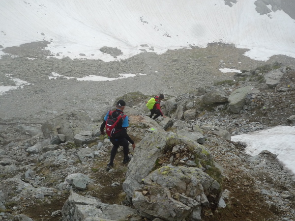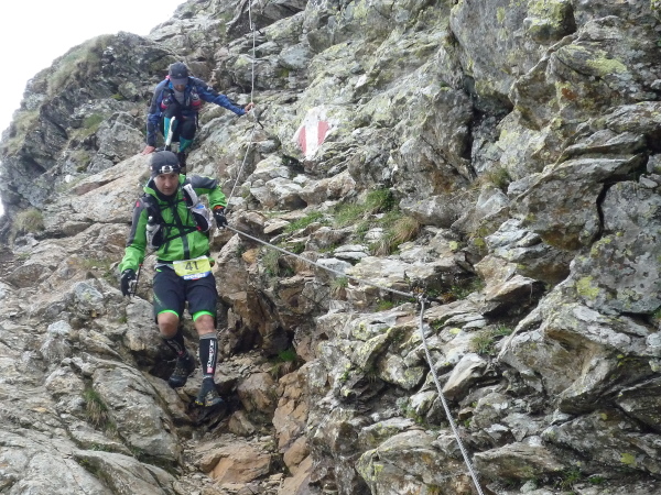 Ein Stück des durch Geröll weiterführenden Weges kann ich noch ohne künstliches Licht bewältigen. Dann muss die Stirnlampe her. Die zweite Nacht beginnt endgültig. Die beiden anderen Läufer und die Schlussläufer der Bergwacht schließen auf und gemeinsam setzen wir die Laufreise fort. Eine weise Entscheidung. Denn: Wahrlich anspruchsvoll war der Anstieg. Aber noch anspruchsvoller sind die Abstiege. Im Licht von fünf Stirnlampen lassen sich die Tritte im Fels, aber auch die sich darunter auftuenden Abgründe sehr viel besser ausmachen. Seile sichern extreme Stellen. Aber auch der Rest hat es in sich. Im Schneckentempo tasten und krabbeln wir über Geröll und steile Stufen einen Grat hinab. Zumindest wir Läufer. Die zünftigen Bergwachtler zeigen uns mal wieder, was eine Berggämse ist. Das mit dem Gen hatte ich ja schon erwähnt. Gleichzeitig sind sie überaus hilfsbereit, freundlich und einfach gut drauf. Ich gebe ganz offen zu: Diese Passagen hätte ich nächtens nicht allein durchsteigen wollen.