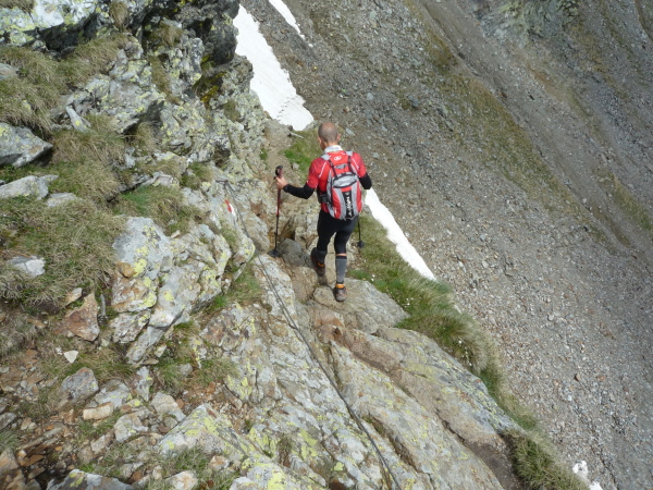 Dass ich gleich noch einige Höhenmeter zulegen muss, stört mich gar nicht. Und dass es teils fast senkrecht über Abgründe auf einem seilgesicherten Steig hinauf geht, erhöht nur den Reiz des hochalpinen Erlebnisses. Da das Wetter hält, darf ich mich immer wieder an traumhaften Aussichten berauschen, vor allem von dem Grat, den ich schließlich erreiche. Ein Erinnerungsbild muss schon sein und der hier wachende Bergwachtler ist gerne behilflich.