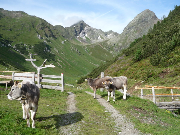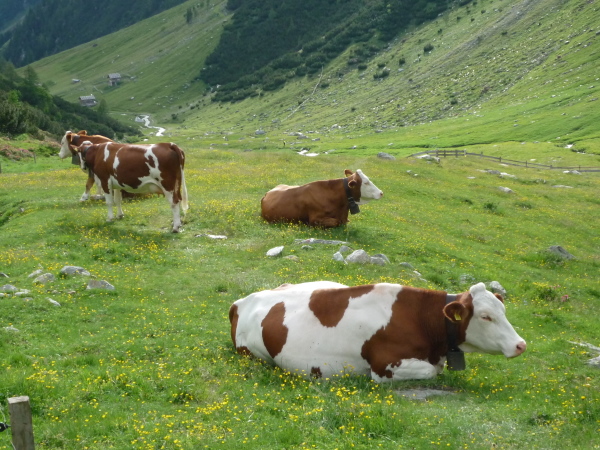 Intensives Grün löst das Felsengrau und den Schnee ab. Ich blicke hinab in ein einsames Bilderbuchtal. Ein bequemer Serpentinenweg lädt zum Jog durch die blühende Natur ein. Endlich habe ich mal wieder das Gefühl, nicht nur zum Wandern hier zu sein. Unten im Tal rauscht ein wilder Bach, grasen friedlich die Kühe auf den in der späten Nachmittagssonne leuchtenden Weiden. Und ich komme einmal mehr vom rechten, sprich markierten Weg ab. So suche ich mir meinen eigenen Weg durch sumpfige wassertriefende Wiesen voller mülltonnengroßer Kuhfladen. Beim Versuch, unter einem Weidezaun durchzutauchen, mache ich unangenehme Bekanntschaft mit diesem. Wie eine dicke Kopfnuss fühlt sich der versehentliche Kontakt an, jedenfalls bin ich danach eindeutig wacher.