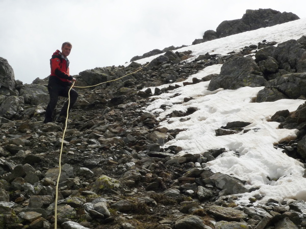Der Blick auf der anderen Seite des Grates hinab flößt Respekt ein. Ui, gehts da steil runter! Aber die Bergwacht hat an alles gedacht. An einem langen Seil werde ich zunächst quer über ein überaus rutschiges Schneefeld gelotst und gleite dann über ein noch viel längeres Seil durch das Geröll in die Tiefe. Und wieder umgibt mich die totale Bergeinsamkeit. Auf ausgesetzten Pfaden setze ich meinen Weg durch „Klein-Alaska“ fort. Je tiefer ich gelange, desto mehr erobert das Grün die Landschaft zurück und desto mehr umspült das Wasser die Wegstrecke. Kleine Seen haben sich in den Senken gebildet und im Tal vereinigen sich die zahllosen Bäche in einem ungewöhnlich breiten Bett fast zu Flussgröße.