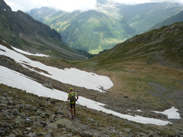 Wie aus dem Nichts taucht auf einmal ein Mann auf. Kein Läufer, dafür mit Hund. Locker marschiert er durch die Landschaft. Ein paar freundliche Worte wechselt er mit mir, wünscht mir viel Glück und verschwindet irgendwo im Nichts. Tja, eben ein Südtiroler. Ich bin mir mittlerweile sicher, dass die irgendein spezielles Berg-Gen haben müssen.
