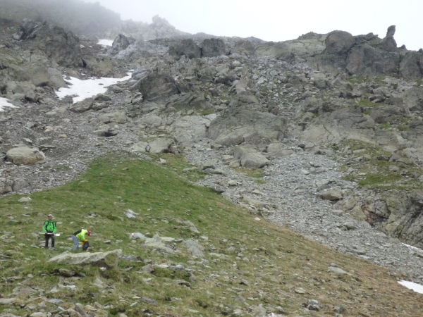 Auf einem kaum als solcher erkennbaren Wiesenpfad setzt sich unser Kurs im Zickzack über den durch und durch triefenden, steil empor führenden Wiesenhang fort. Einmal mehr werde ich das Gefühl nicht los, als klettere ich auf einem einzigen riesigen Schwamm herum, aus dem es überall rinnt und rieselt, was nur durch die üppige Grasmütze nicht gleich sichtbar wird. Bei jedem Tritt muss ich genau hinschauen, wo er endet. So schnell wie es meine Kraft und Puste erlauben stemme ich mich in die Höhe hinauf.