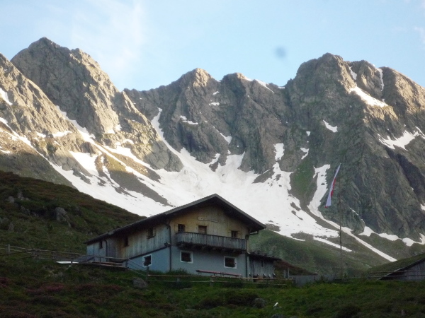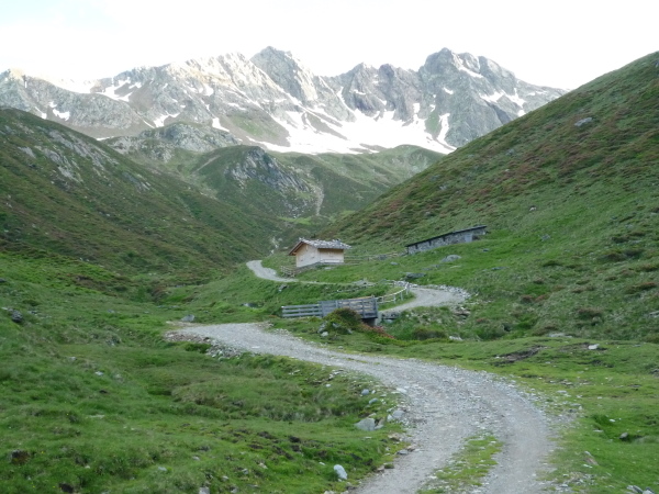 Vor den anderen ziehe ich los. Möglichst noch bei Tageslicht will ich die nächste große Hürde nehmen. 850 Höhenmeter gilt es in einem Schwung zu bewältigen, hinauf zum sich vor mir im Talschluss auftürmenden Alpler Nieder (2.624 m üNN). Entlang der bequemen Schotterstraße, die mich zur Ebenbergalm gebracht hat, geht es weiter der Felswand vor mir entgegen. Bis es nicht mehr weiter geht und die Straße einfach zu Ende ist.