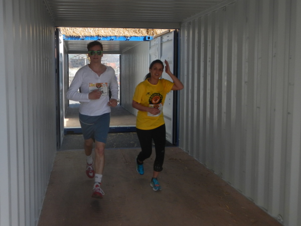 Gespannt warte ich auf die ersten Hindernisse, bei welchen es zur Sache geht. Über zwei Kilometer ist es für meine Begriffe gepflegtes Crosslaufen bei trockenen Bodenverhältnissen. Ein paar Wellen, Gruben und Löcher, mehr nicht. Dann gibt es schon eine Tränke mit Iso und Wasser. Kurz danach geht es durch zwei Zwanzigfuß-Standardcontainer. Die Schnelleren kraxeln schon in der Querrichtung darüber. Wie viel Vorsprung sie haben, wird mir erst nach geraumer Zeit bewusst.