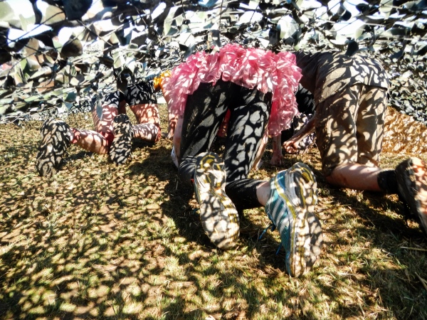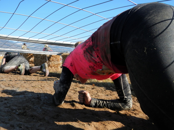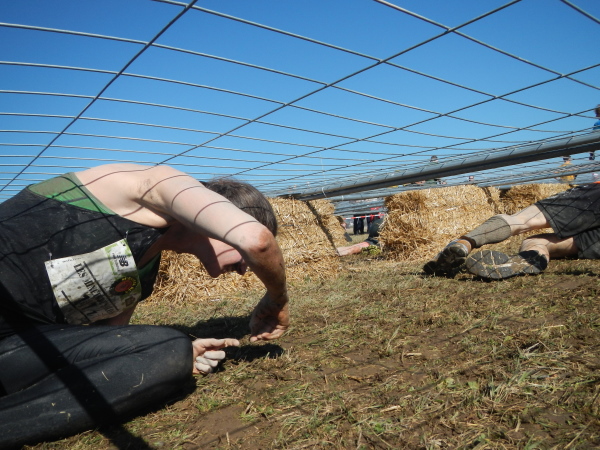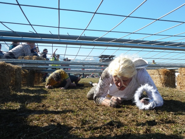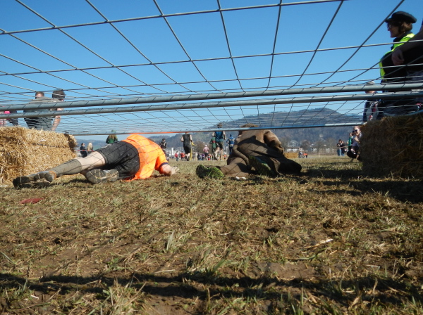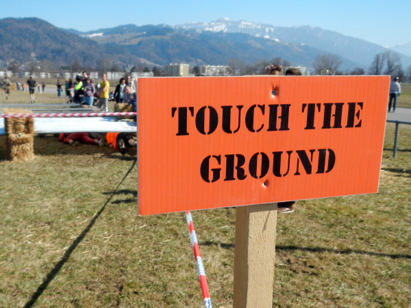 Wie ich den Namen des nächsten Hindernisses lese, beginnt es mich auf dem Kopf zu jucken: Das große Krabbeln. Hier geht es aber glücklicherweise nicht um die erste Schulwoche nach den großen Ferien mit Besuch der Laustante. Auf allen Vieren dürfen wir uns über die Bodenbeschaffenheit der Thuner Allmend informieren. Über uns ein Tarnnetz, in welchem sich des Häschens Stummelschwänzchen festhaken könnte – wenn es noch da wäre. Es ist sozusagen die Vorübung für das, was als nächstes kommt: Touch the ground. Zwischen Berühren und Küssen sind die Grenzen manchmal bekanntlich fließend. Immerhin muss man den Schweizern zugutehalten, dass sie keinen Viehhüter an das Gitter angeschlossen haben, unter welchem wir nun durchkriechen. (Da sind die Engländer beim Original gnadenlos und verteilen Elektroschocks, wenn der Hintern zu hoch gehalten wird.)