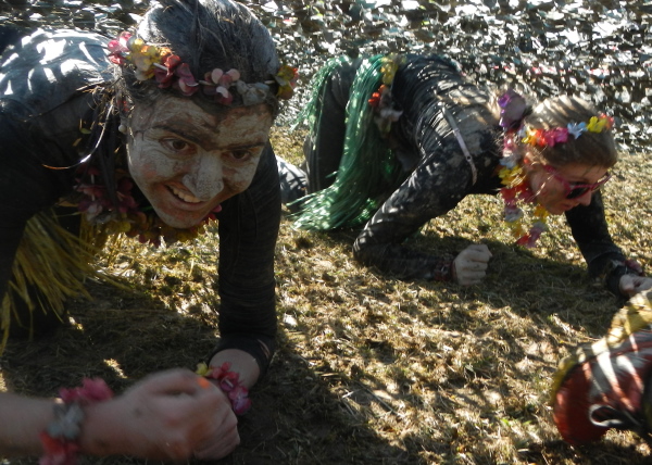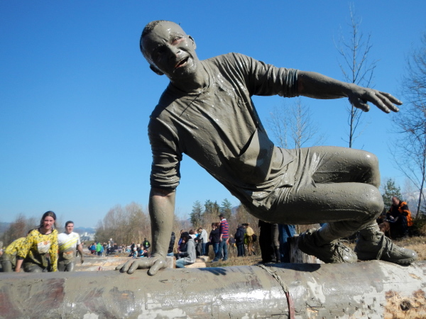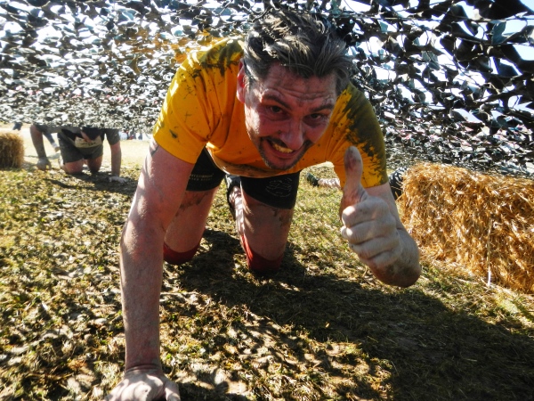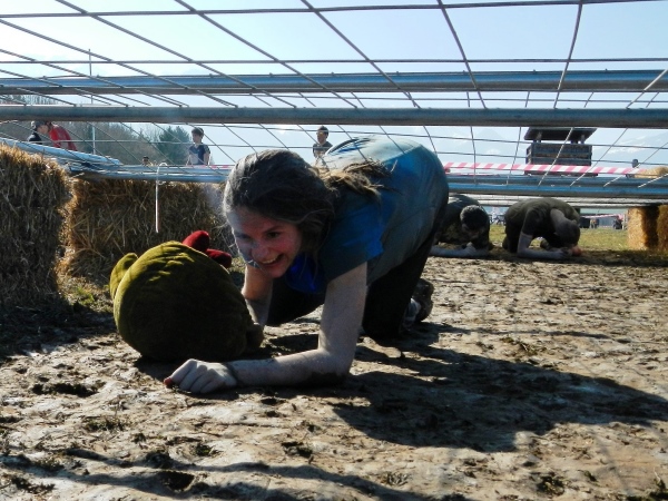 Auf den zweiten neun Kilometer werden einige vollends vom Übermut ergriffen. Weil sie wissen, was sie nachher noch alles erwartet, leisten sie es sich, nicht nur durchs Schlammbad zu gehen, sondern nehmen dieses Hindernis mit einem Hechtsprung in Angriff. Mit der Folge für mich, dass ich eine Zuschauerin bitten muss, das Kameraobjektiv mit dem Pulloverärmel zu säubern.