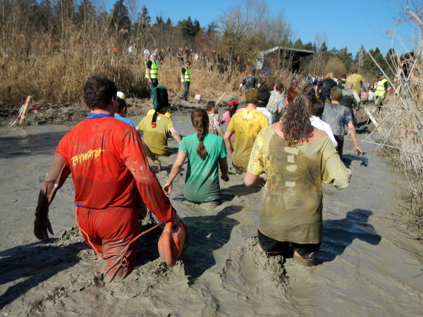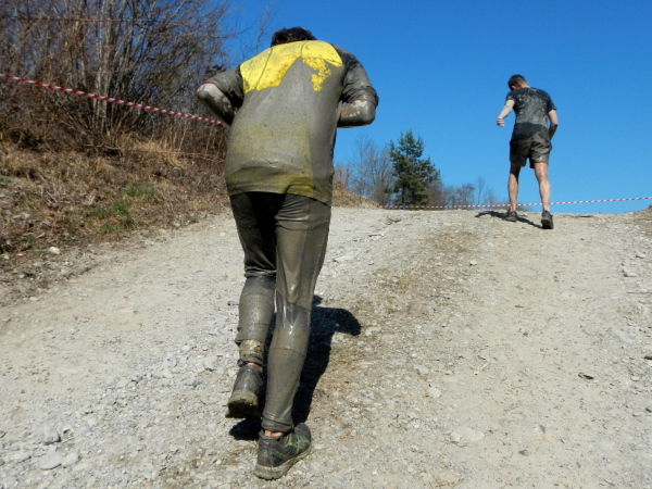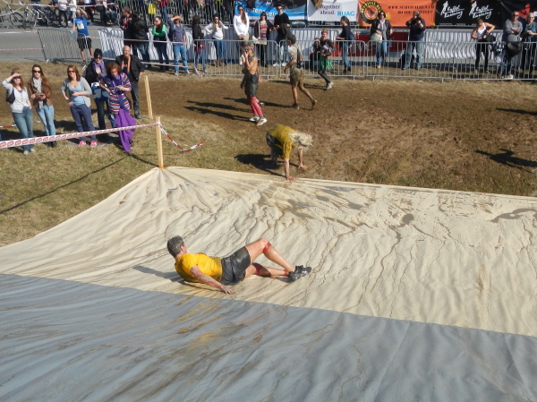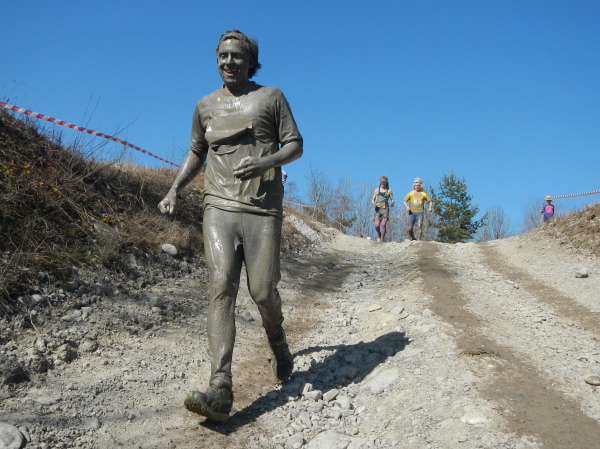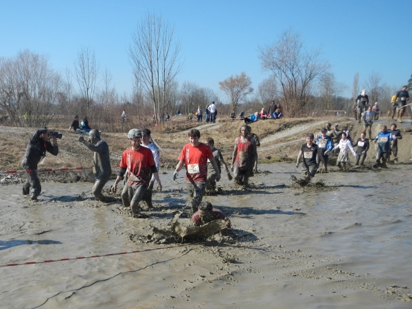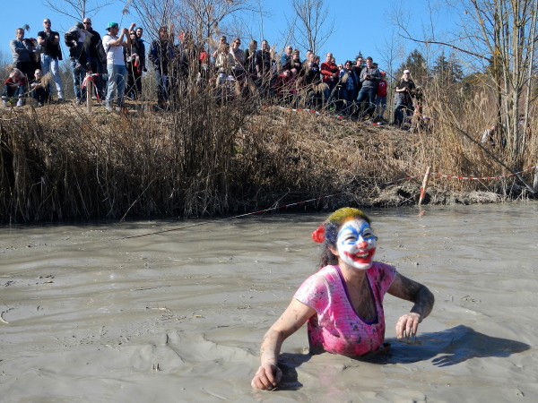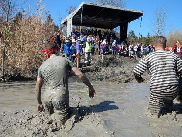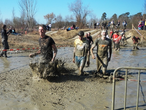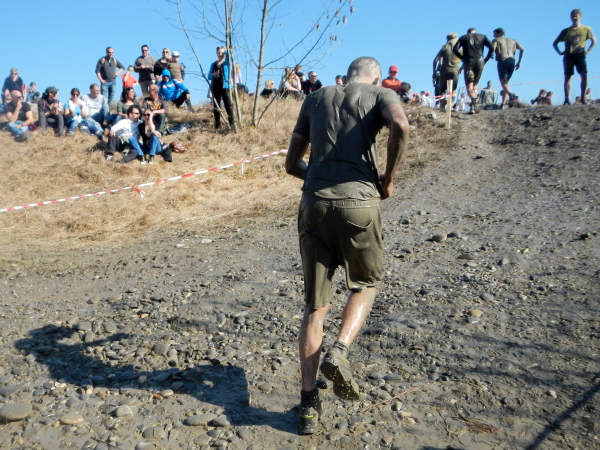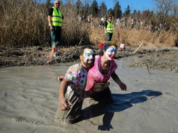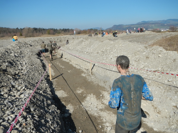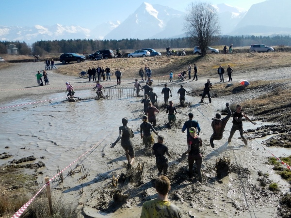 Die ersten Pfützen auf der folgenden Schotterpiste werden links und rechts umgegangen – die meisten darauf bedacht, sich nicht schmutzig zu machen, und dies im vollen Wissen, dass der Moment der nassen Wahrheit naht. Der kommt unmittelbar danach in Form eines langen Schlammgrabens. Von der grauen Brühe geht nicht unbedingt ein Wohlgeruch aus und der Matsch am Boden zieht mir beinah die Schuhe aus. Was denken die Leute auf der Tribüne am Rand dieses Tümpels? Was überwiegt? Die Schadenfreude über die Armen, welche mit einem Fuß stecken bleiben und das Gleichgewicht verlieren oder die Bewunderung für den Mut, sich auf sowas einzulassen?