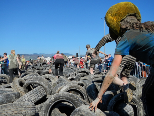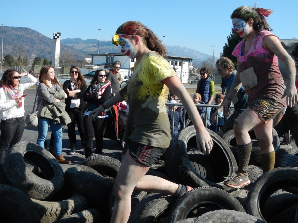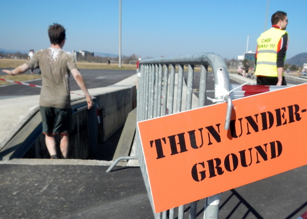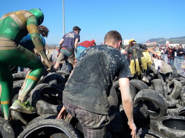 Hop on, hop off hat nichts mit Häschen zu tun. Es sind wieder Strohballenmauern, die den Rhythmus brechen, bevor wir in die Nähe des Start- und Zielbereichs kommen. Thun Underground wartet weder mit Abwasserkanälen noch Katzengräsern Ratten auf, doch es empfiehlt sich, den Kopf rechtzeitig einzuziehen und nicht zu frühzeitig wieder auszufahren. Kaum läuft man wieder hoch erhobenen Hauptes in Richtung Ziel, bremsen einen die „Wheels on fire“ ein. Zwischen Absperrgittern liegen Berge von Altreifen. Ich gestehe, dass ich mich stark an die Randzone halte, wo das Risiko, hängenzubleiben und damit heftige Bewegungen und Richtungsänderungen der Knochen, Knorpel, Bänder, Sehnen und Muskeln zu provozieren, gering ist.