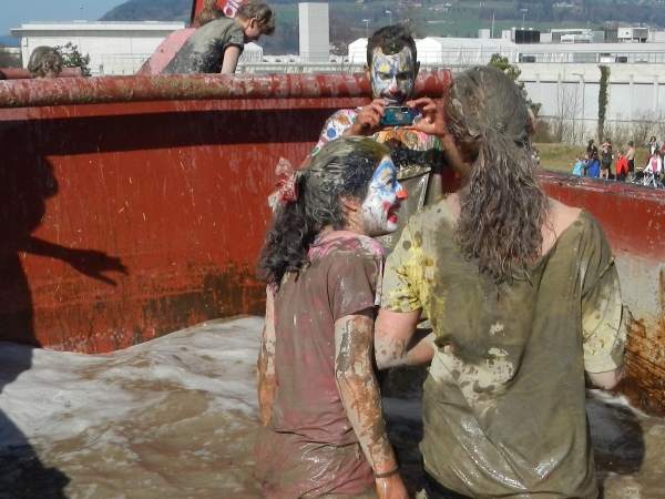 Nach dieser kleinen Strapaze und den mittlerweile fünf zurückgelegten Kilometern ist schon bald wieder eine Abkühlung fällig. Sie kommt beim Taucher-Hindernis in Form eines über einen Hohlweg gespannten Tarnnetzes, unter welchem es in geduckter Haltung durchs Wasser zu waten gilt. Dies ist nur der Auftakt zu den weiteren im Alltag als Widerwärtigkeiten erlebten Dingen. Hier und heute ist es einfach nur Fun. Da kann man die Schweizer Geschichte schon so umbiegen, dass aus der Schlacht bei Morgarten die Schlacht im Moorgarten wird. Feuchtgebiete könnte man es auch nennen. Die auch hier zahlreichen Zuschauer amüsieren sich köstlich, noch mehr Spaß haben aber eindeutig wir, die wir mittendrin dabei sind. Für ein paar Jungs gehört dazu auch eine Prise Schnupftabak, mit welcher das gefeiert wird.