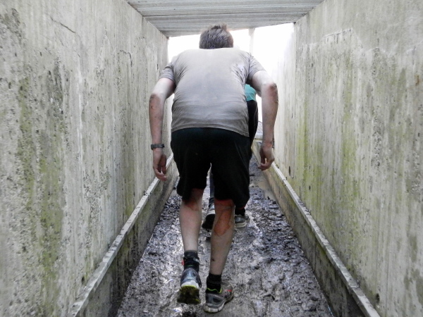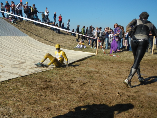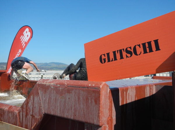 In Anbetracht meiner Krankenakte schäme ich mich nicht, auf die Pussy Lane auszuweichen. Häschen würde das besser auch tun, denn in den Reifenbergen verliert der Hoppler nun auch seine Löffel und bemerkt es erst anfangs zweite Runde. Auf dem Weg zu der steht auf einer Anhöhe noch die „Glitschi“, zwei nebeneinander aufgestellte Containerwannen. Großgewachsene haben einen eklatanten Vorteil beim Erklimmen der Wannenwand. Das Wasser in der Wanne ist mittlerweile so gefärbt, dass nicht sicher ist, ob man vor dem Betreten nicht gar sauberer war. Wer mit zu viel Schwung über den hinteren Rand hechtet, legt auf der schmierigen Plastikplane eine unsanfte Landung hin und rutscht und flutscht im Eiltempo den Hang hinunter und kommt erst in der aufgeweichten Wiese zum Stillstand.