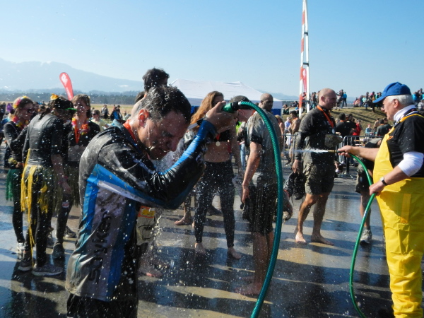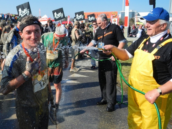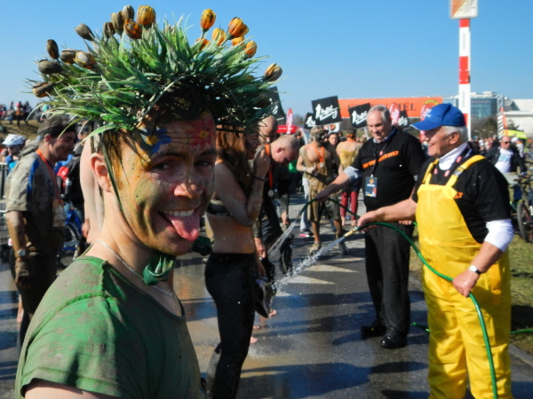 Fürs Vorwaschprogramm gibt es hilfsbereite Freiwillige, denen es sichtlich Spaß macht, den Dreckspatzen mit dem Gartenschlauch wieder ein Antlitz zu verleihen. Da ich mich zur Schonung der Kamera so wenig wie möglich eingesaut habe, kann ich mir das ersparen und direkt zur Umkleide und dem Duschzelt mit den sehr heißen Duschen marschieren.