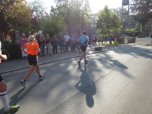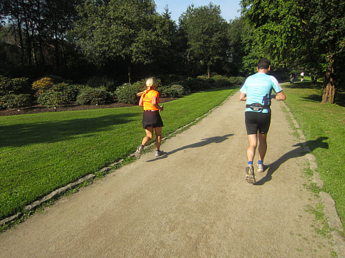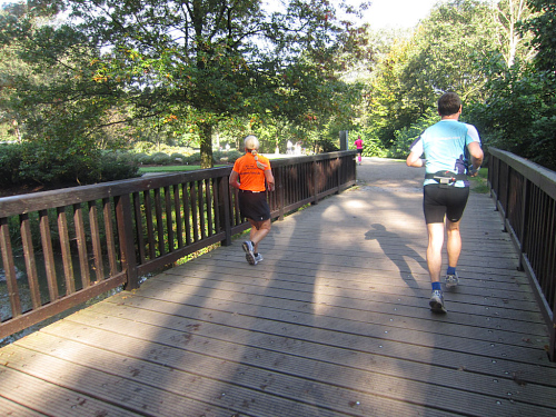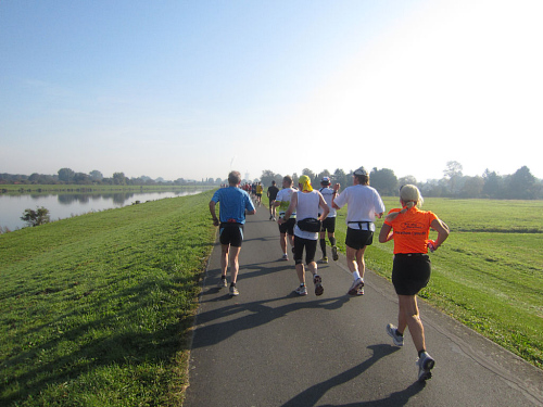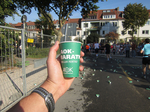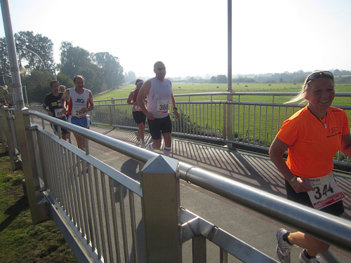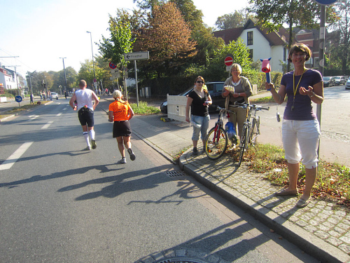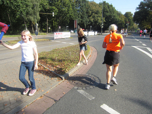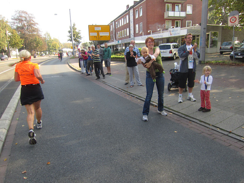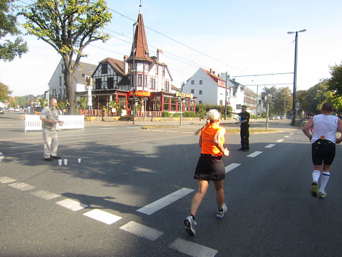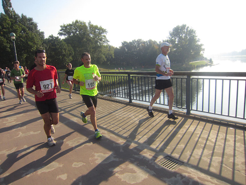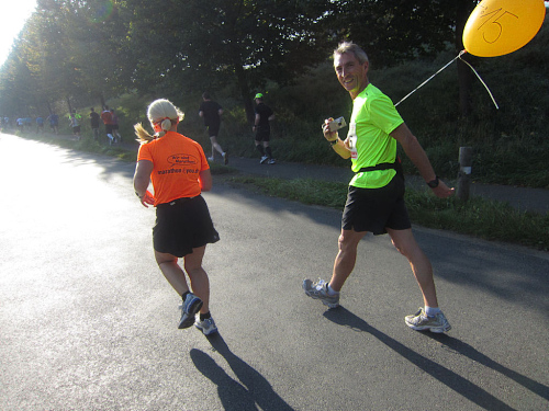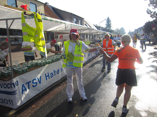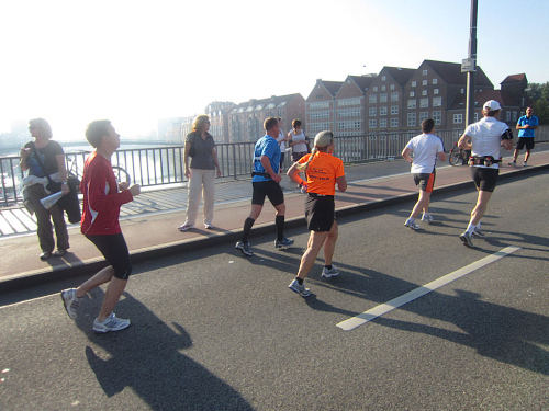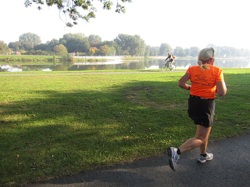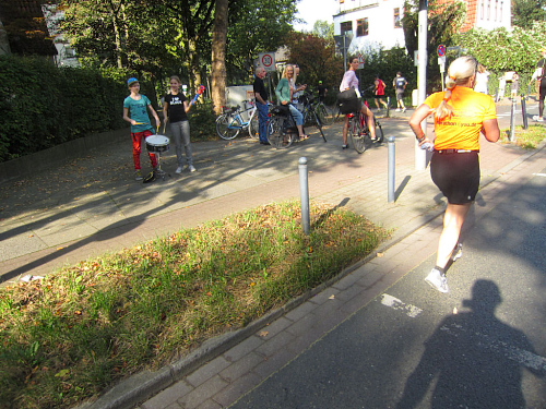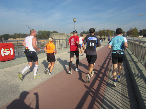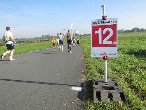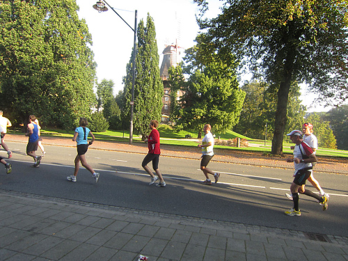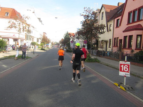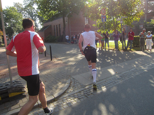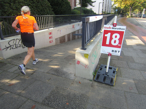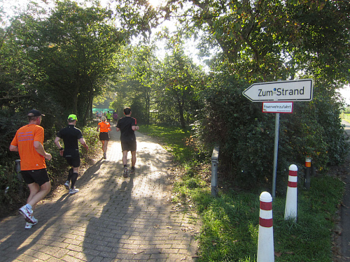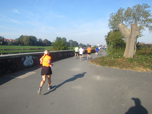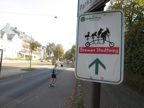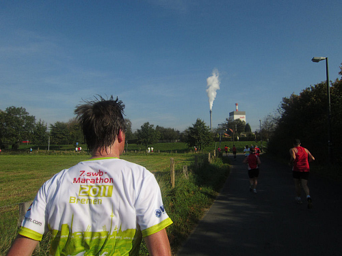 KM 10: Holzdamm - wir sind knapp eine Stunde unterwegs. Die Strecke motiviert. Ganz anders als in Berlin. Wer die Bremer – nur weil sie im Norden leben – für unterkühlt hält, wird heute eines Besseren belehrt. Stimmung pur, auf eine angenehme Art und Weise. Überall höre ich Bremer Stadtmusikanten. Wunderschön ist hier das Nah-Erholungsgebiet Werdersee. Einige hundert Meter kann ich neben der Strecke auf einem Trampelpfad laufen und das tut den Füssen gut. Alle 2,5 Kilometer bekommen wir Schwämme, Getränke und Verpflegung von sehr freundlichen Helfern gereicht.