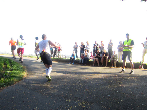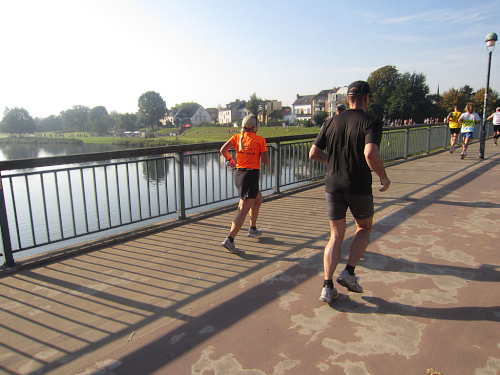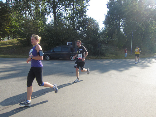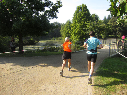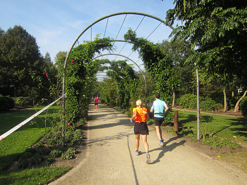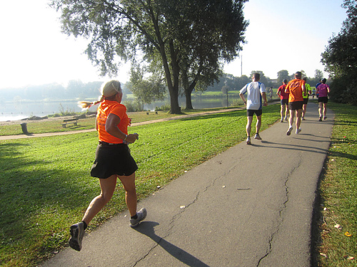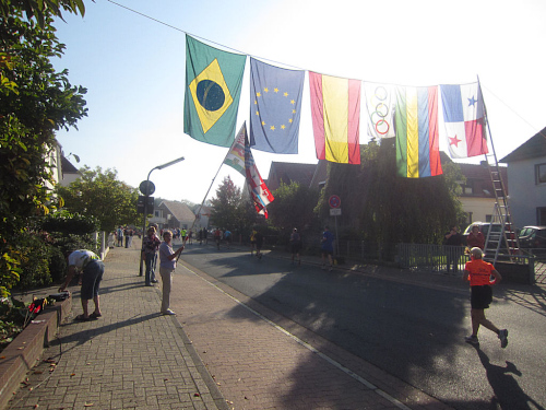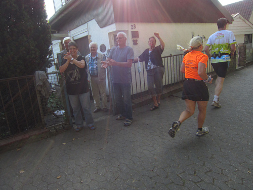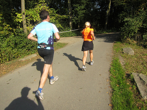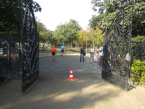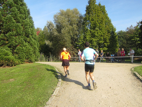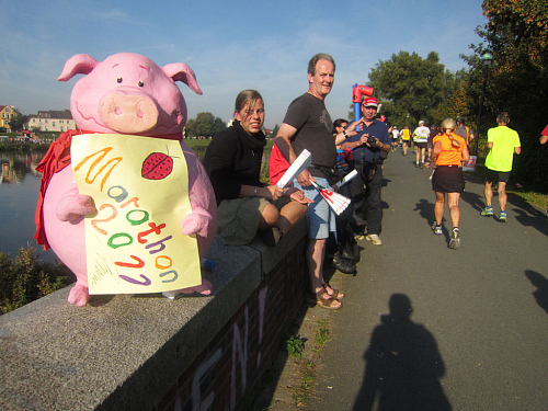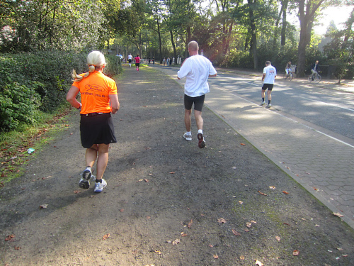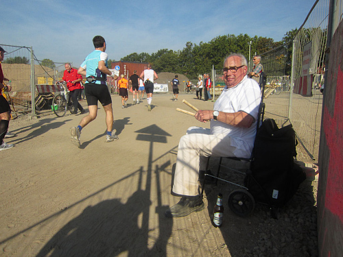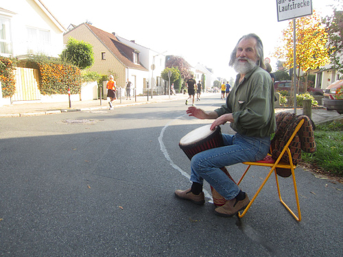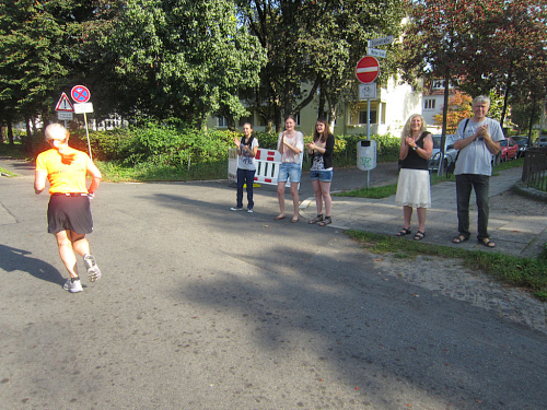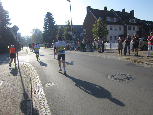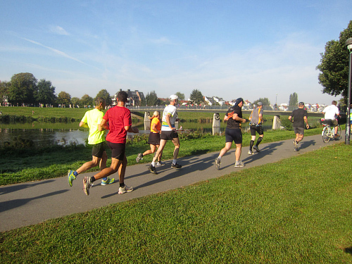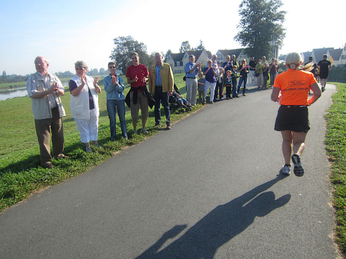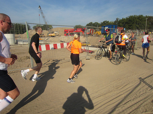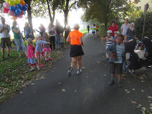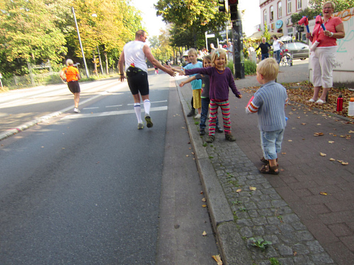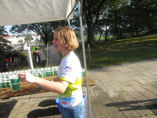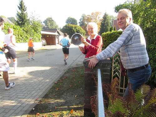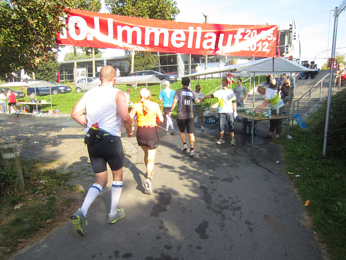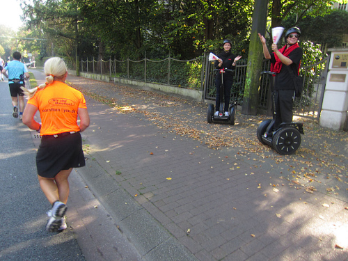 KM 10: Holzdamm - wir sind knapp eine Stunde unterwegs. Die Strecke motiviert. Ganz anders als in Berlin. Wer die Bremer – nur weil sie im Norden leben – für unterkühlt hält, wird heute eines Besseren belehrt. Stimmung pur, auf eine angenehme Art und Weise. Überall höre ich Bremer Stadtmusikanten. Wunderschön ist hier das Nah-Erholungsgebiet Werdersee. Einige hundert Meter kann ich neben der Strecke auf einem Trampelpfad laufen und das tut den Füssen gut. Alle 2,5 Kilometer bekommen wir Schwämme, Getränke und Verpflegung von sehr freundlichen Helfern gereicht.