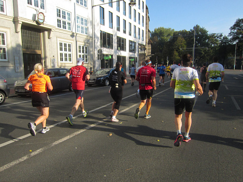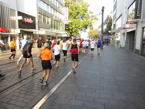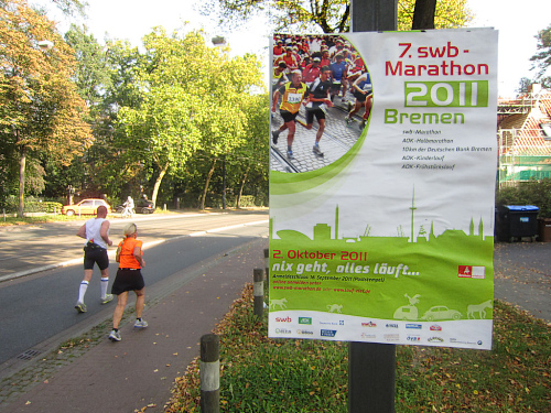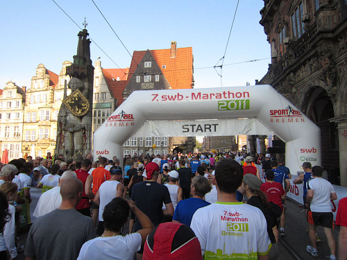 Für die Marathonläufer fällt der Startschuss für den 7. swb-Marathon, allein das ist ja schon eine Glückszahl, um 9:45 Uhr. Bis dahin betrachten wir uns noch die Läufer auf ihrem Weg zum entsprechenden Startblock. Auf den Startnummern kann man nicht nur den Namen lesen, sondern auch das Alter und am interessantesten: die selbst eingeschätzte Zielzeit. Wir bekommen ja fast Komplexe. Danach würde kaum ein Läufer über 4 Stunden unterwegs sein. Wie fast immer, stellen wir uns ganz hinten ins Starterfeld als auch schon der Startschuss fällt. Die Atmosphäre ist entspannt als wir in die Obernstraße laufen auf der früher Pferdebahnen fuhren. Von 1821 bis 1824 wohnte hier die Serienmörderin Gesche Gottfried und in der "Rathsapotheke" soll sie ihr Gift gekauft haben. Die Straße gehörte zu den ersten Hauptstraßen des mittelalterlichen Bremens. 1157 wurde sie erstmals als „superior platea civitas“ erwähnt. Sie ist Teil einer weitläufigen Fußgängerzone und damit die Haupteinkaufsstraße der Bremer. Die Firma Karstadt betrieb schon 1902 hier ein Warenhaus.