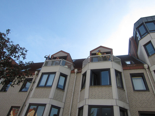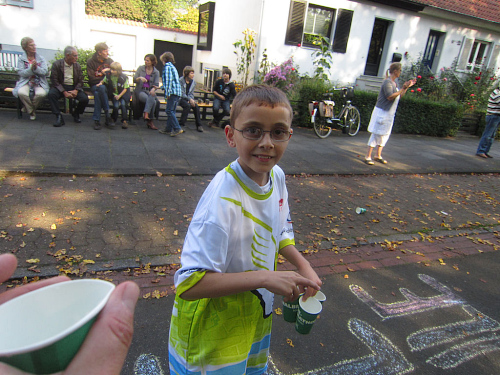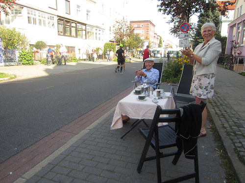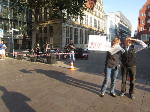 Bremer Straßenmusikanten heizen uns ein. Stadtmusikanten gibt es seit dem 14. Jahrhundert in Bremen. Selbst der Großvater von Udo Jürgens ließ sich von den Musikanten inspirieren und uns motivieren sie heute. Jetzt sind wir am Brill. Es ist ein zentraler Platz in Bremens Mitte. Die Brauerei Beck und Co. ist durch das dort gebraute Becks Bier weltbekannt. Der Platz ist eine stark befahrene Kreuzung, aber die Polizei regelt die „Vorfahrt“ für uns. Der Brill war im Mittelalter bis zum 16. Jahrhundert eine Pforte in der Bremer Stadtmauer. Die Bezeichnung Brill bedeute damals Loch oder Öffnung, zum Beispiel Abortöffnung. An der Strecke sind heute für uns allerdings eine Reihe von Plastikhäuschen aufgestellt worden.