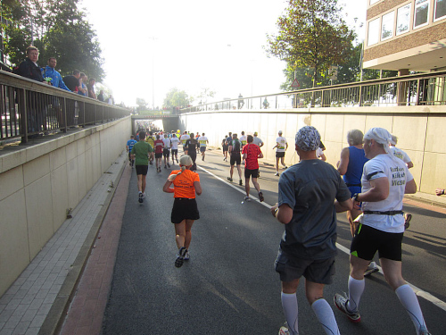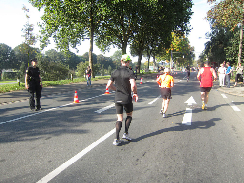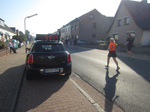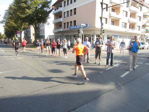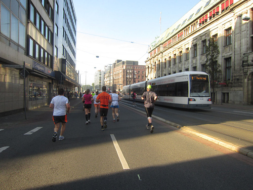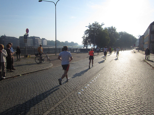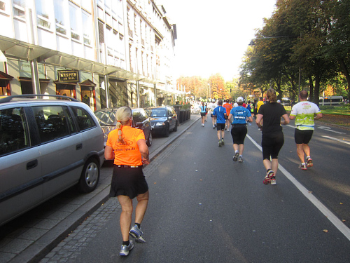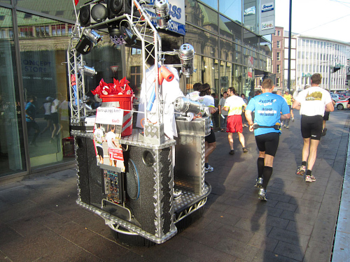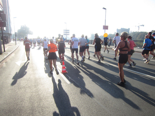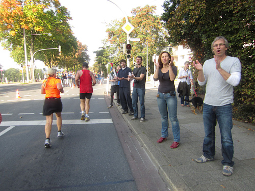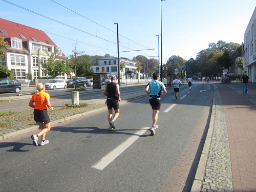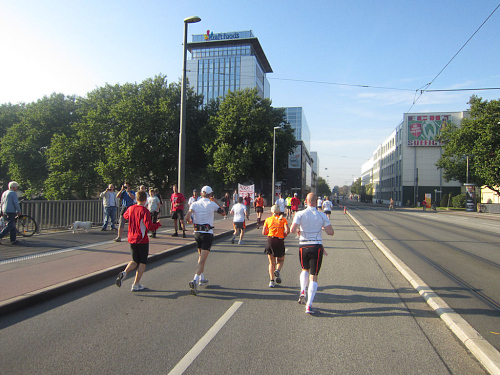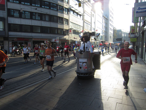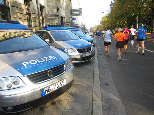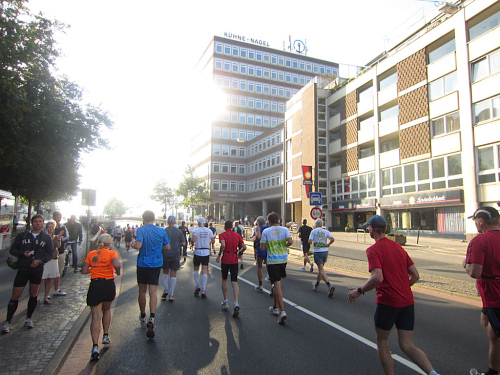 Wir sind bei KM 15. Wahrscheinlich begeben sich nun die Halbmarathonis auf die Strecke. So langsam kommen wir zur Kurfürstenallee. Der schnellste Marathonläufer wird nach rund 2:30 Stunden im Ziel erwartet. Anstatt auf Marathon-Weltstars, wie in der Hauptstadt, konzentriert man sich hier auf die Top-Läufer der Hansestadt und dem niedersächsischen Umland. KM 18. Wow, was passiert hier? Die Strecke führt durch eine Unterführung und da unten geht’s ab. Laserdisco und DJ. Bei 20 KM biegen wir in die Marcusallee. Da fällt mir mein Kollege ein. Denn auch wer es eher technisch-deftig mag, der kommt in Bremen auf seine Kosten. Werder, Beck's, Mercedes...