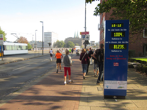 Bremen möchte fahrradfreundlichste Stadt Deutschlands werden und ist damit auf einem guten Weg. Bei KM 4 passieren wir eine Fahrradzählstadion. Die über Zählspulen im Boden erfassten Zahlen sollen Radverkehrsströme erkennbar machen und feststellen, wie viele Radfahrer in Bremen stündlich, täglich, monatlich und jährlich unterwegs sind. Auf der installierten Anzeigesäule gibt es sogar ein "Dankeschön" an die Fahrradfahrer – für ihren Beitrag zum Umweltschutz.