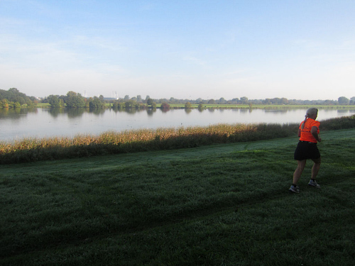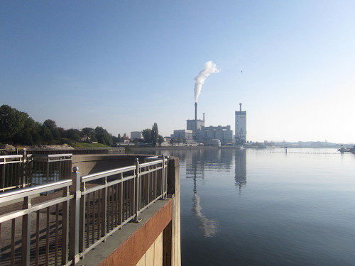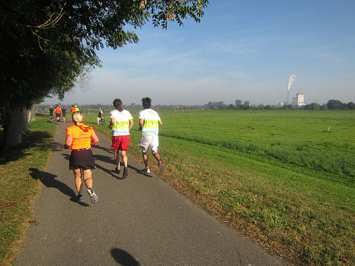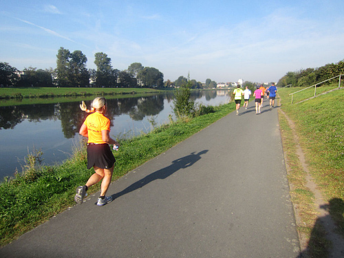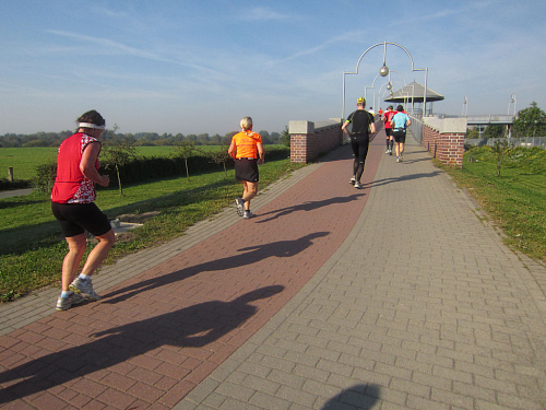 Bei KM 11 erwartet uns ein größerer Grünabschnitt mit Ausblick auf die Weser. So schön das hier ist, aber auch hier müssen die Anwohner mit den Landeanflügen der Flugzeuge auf den Bremer Flughafen leben. Nun laufen wir schnurgerade auf das bereits 1905 erbaute SWB-Kraftwerk Bremen-Hastedt zu und kommen zum Weserwehr. Das Bremer Weserwehr wurde 1993 in Betrieb genommen. Es ersetzt das alte Wehr von 1911. Von weitem dröhnt aus großen Musikboxen „Highway to Hell“. Stimmt, das ist hier wohl auch der höchste Anstieg der gesamten Strecke. Ich find´s einfallsreich dort so musikalisch „hochgepeitscht“ zu werden. Hier kann ich doch meine antrainierte Bergstärke mal so richtig ausspielen. Noch höher ist nur der Hügel der Mülldeponie in Bremen-Blockland mit 49 m ü. NN.
