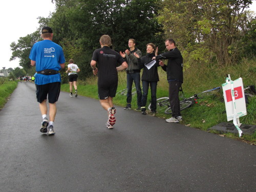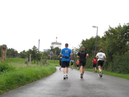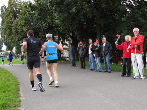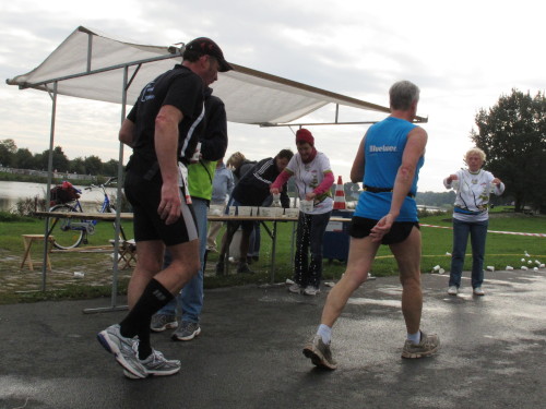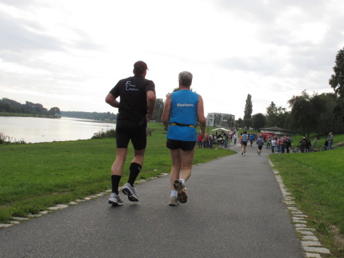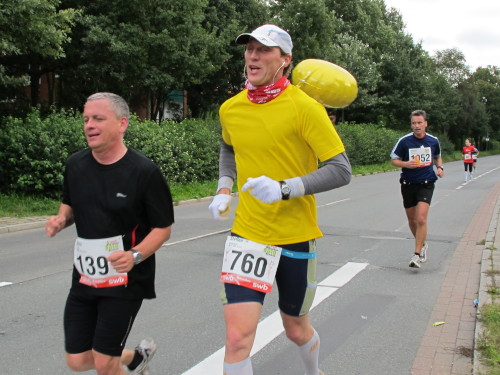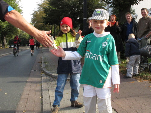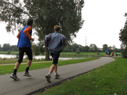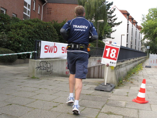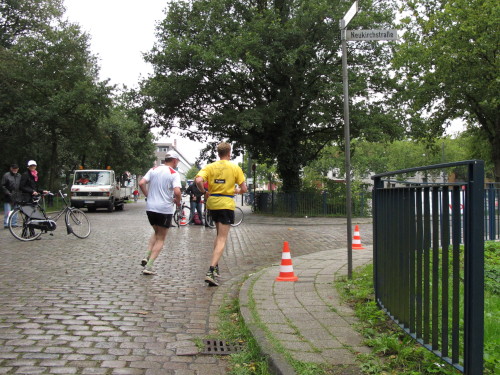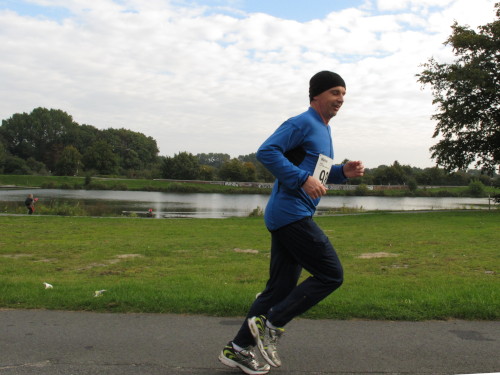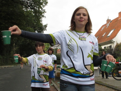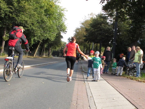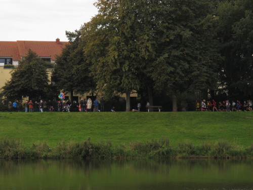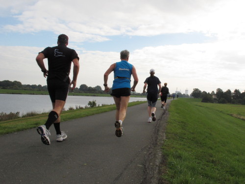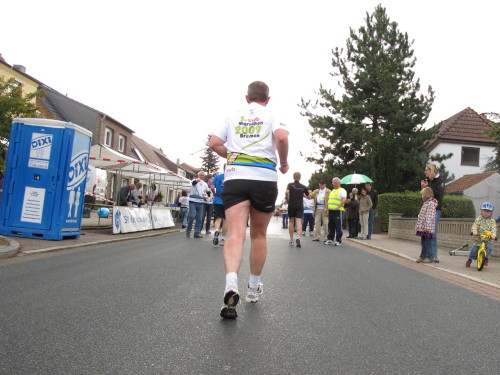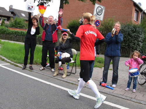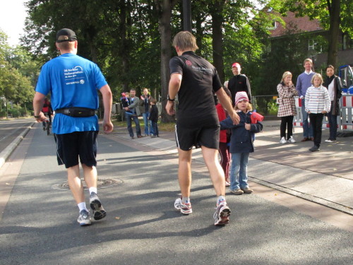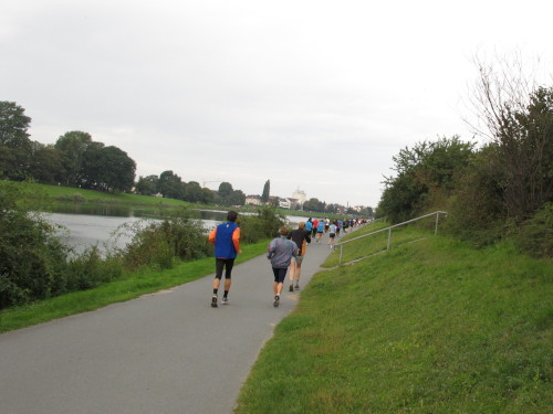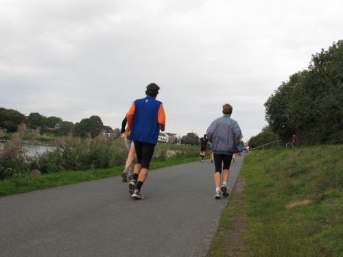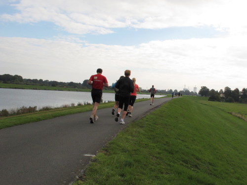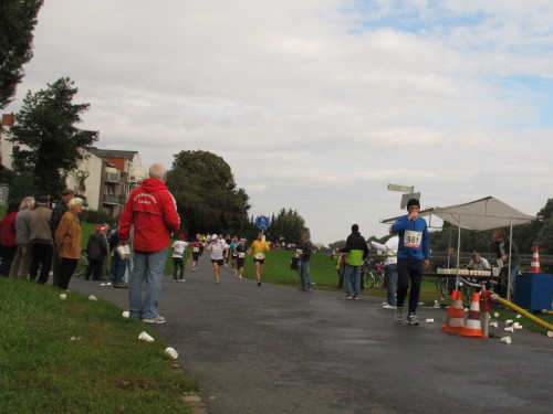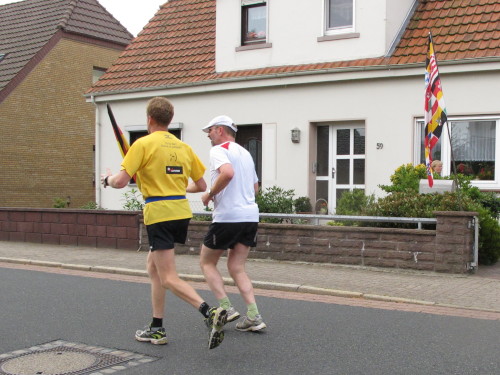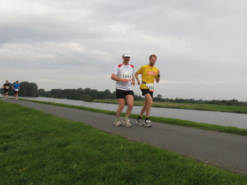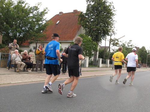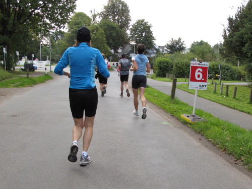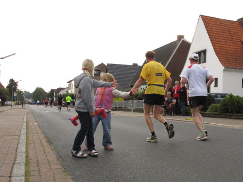Der Mann hat ja recht. Wir laufen auf dem Deich und ich will mir gar nicht vorstellen wie es ist, wenn jetzt von vorn waagerecht der Regen kommt. Es macht Spaß, ehrlich. Ich bin am Wasser, was mir sowieso am liebsten ist, wenn ich keine Berge habe. Die ersten 10 Kilometer sind abgehakt, als wir in Habenhausen den Deich verlassen und gleich bei den ersten Häusern mit freundlichem Applaus empfangen werden. Wasser und Obst gibt es an der Verpflegungsstelle, höhere Ansprüche werden auf Anfrage an dem einen oder anderen Frühstückstisch erfüllt. Die Leute sind echt klasse.