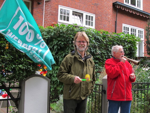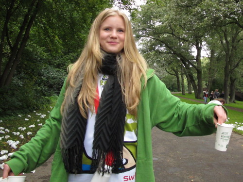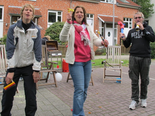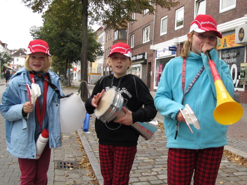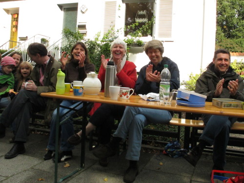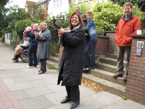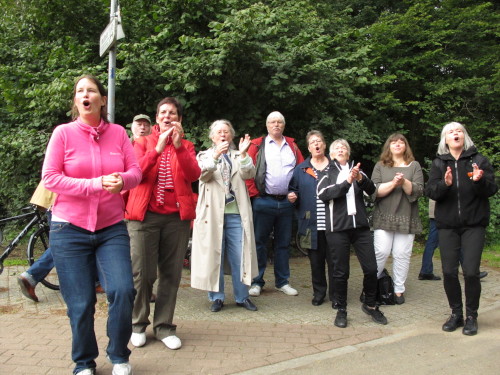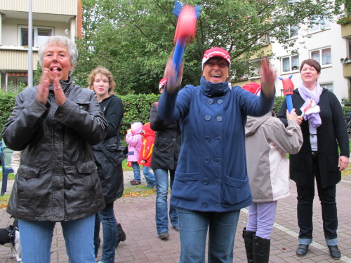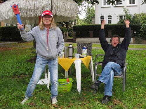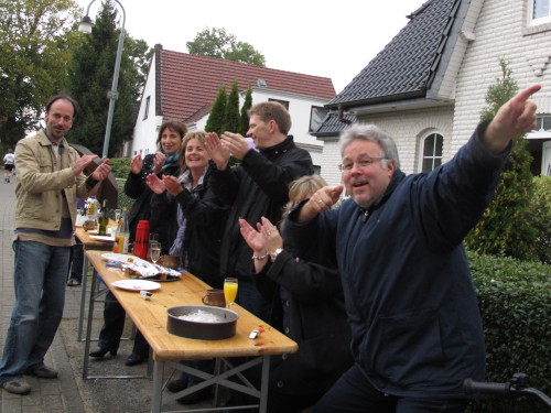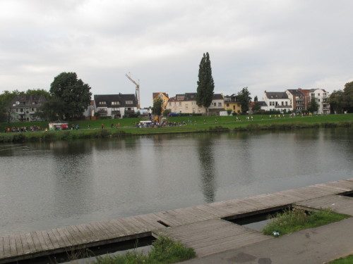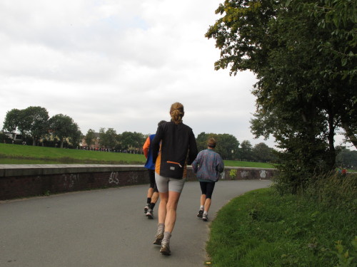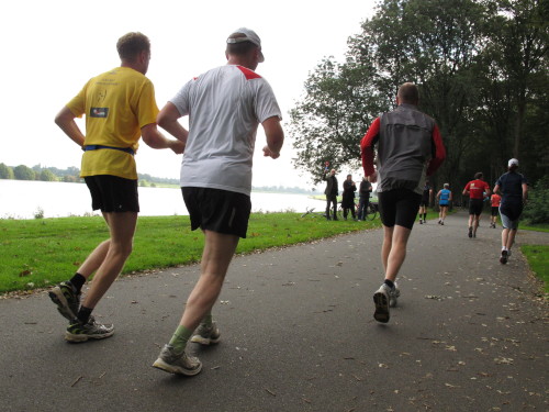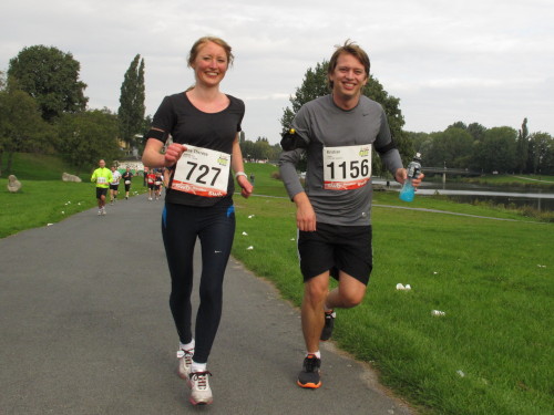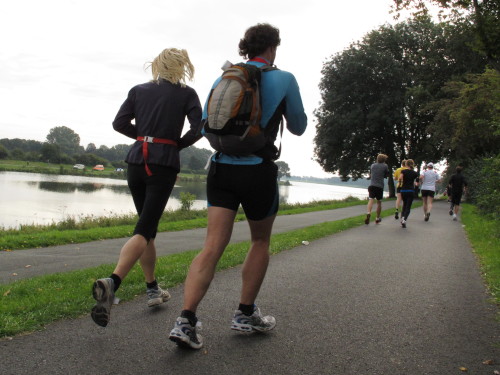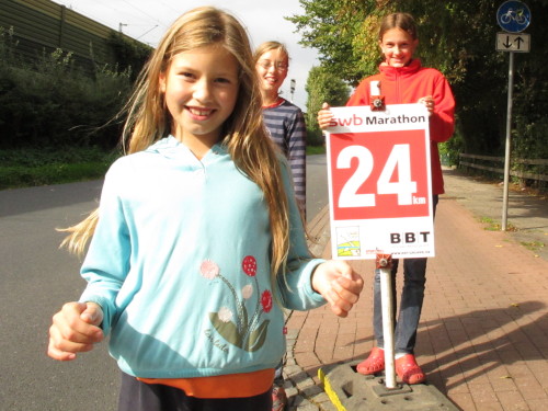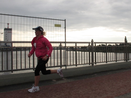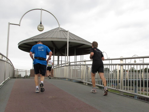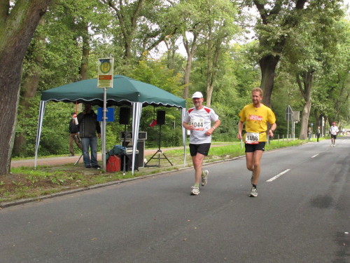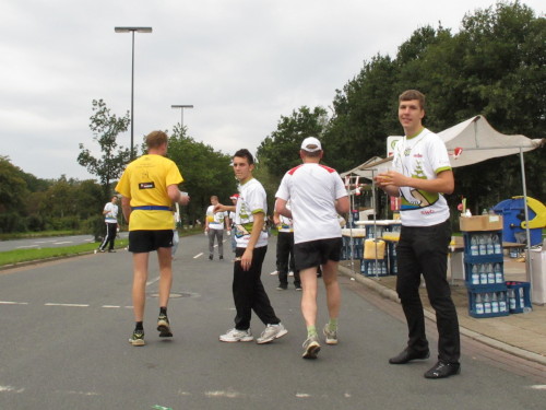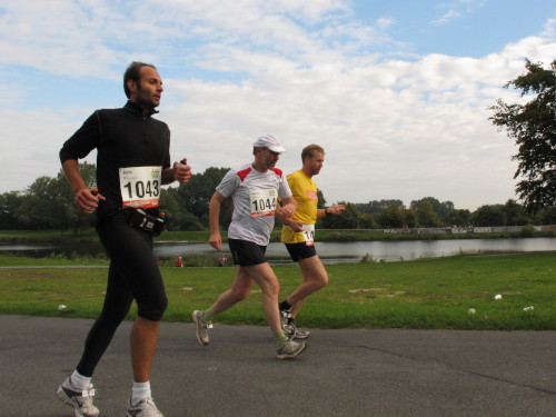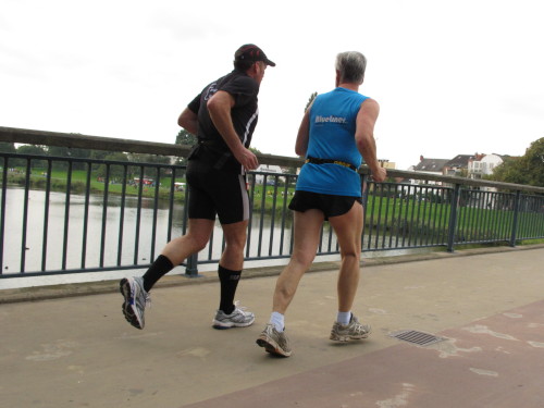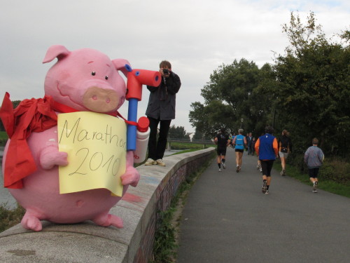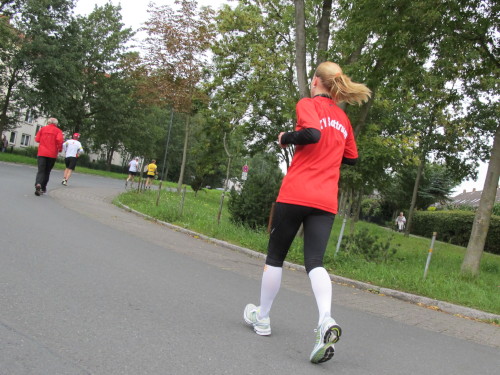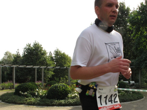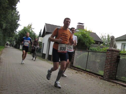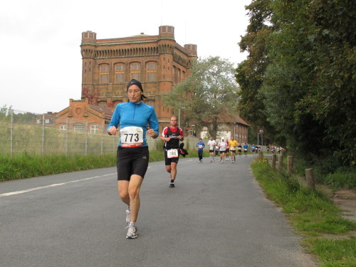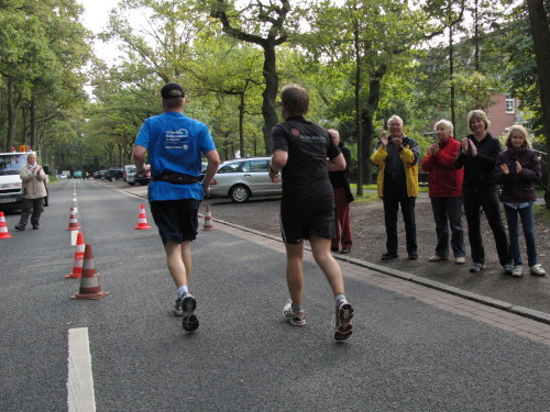 Der Mann hat ja recht. Wir laufen auf dem Deich und ich will mir gar nicht vorstellen wie es ist, wenn jetzt von vorn waagerecht der Regen kommt. Es macht Spaß, ehrlich. Ich bin am Wasser, was mir sowieso am liebsten ist, wenn ich keine Berge habe. Die ersten 10 Kilometer sind abgehakt, als wir in Habenhausen den Deich verlassen und gleich bei den ersten Häusern mit freundlichem Applaus empfangen werden. Wasser und Obst gibt es an der Verpflegungsstelle, höhere Ansprüche werden auf Anfrage an dem einen oder anderen Frühstückstisch erfüllt. Die Leute sind echt klasse.