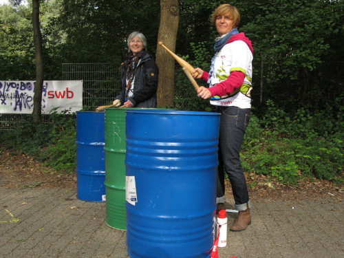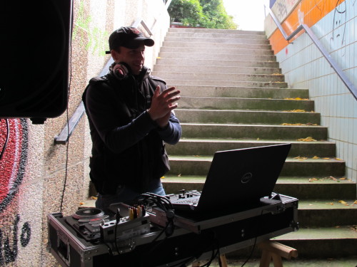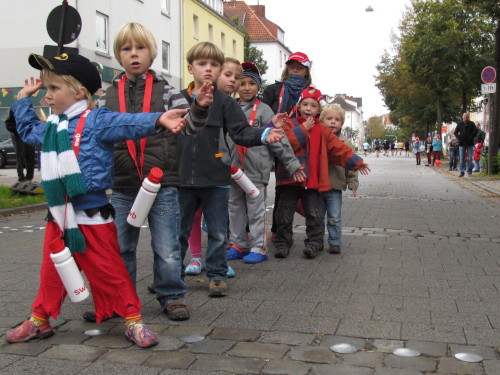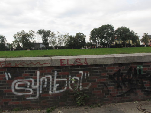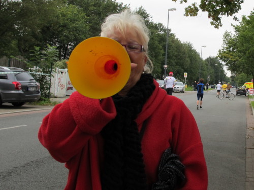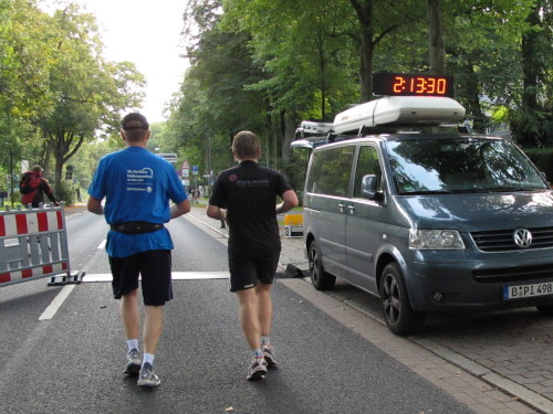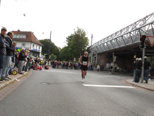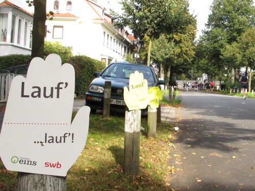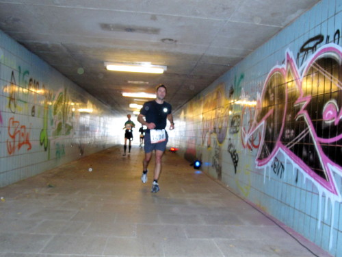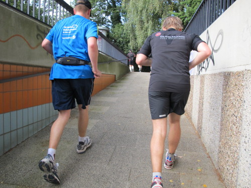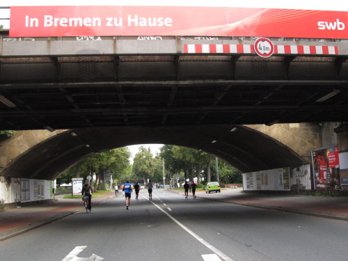Weiter geht es durch das Naturschutzgebiet Neue Weser zum Weserwehr (km 13) mit Fischpass, rechts steht Bremens ältestes Kraftwerk (1907), das der Titelsponsor swb betreibt. Wir sind in Hastedt, meiden zunächst die Verkehrsstraße und laufen unterhalb durch eine Schrebergartensiedlung, ehe es ein kurzes Stück stadteinwärts und dann rechts in die Stader Straße geht. Es ist jetzt nicht so, dass sich die Zuschauer am Straßenrand drängen. Aber vor vielen Häusern stehen Leute, als würden sie auf Dich warten, feuern Dich an und loben Dich ob Deiner grandiosen Leistung. 18 km sind wir gelaufen, das mal so nebenbei. Wir tauchen ab in eine Unterführung und werden mit lauter Rockmusik und bunten Lichtblitzen empfangen. Beim Anstieg danach vergeht mir das Lachen.