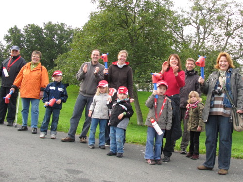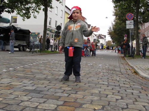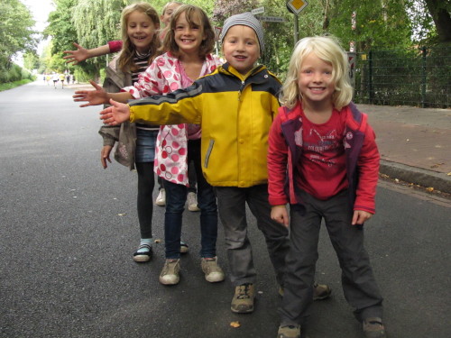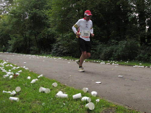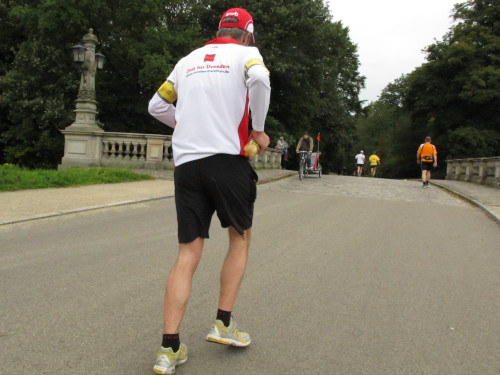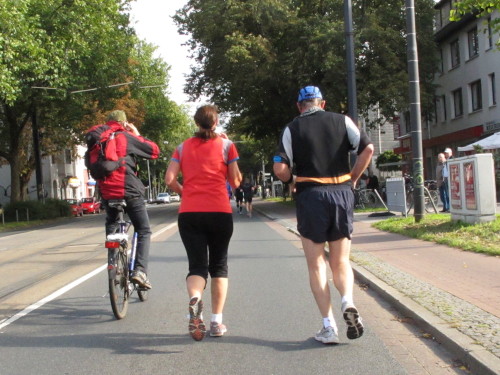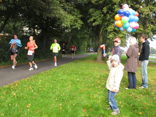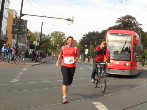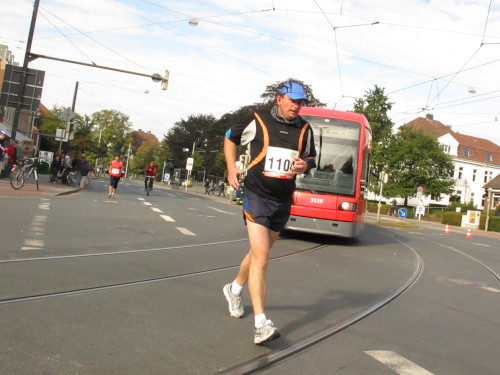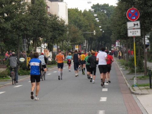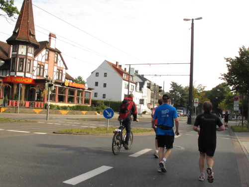 Private Feten und Zuschauergruppen begleiten uns auf den nächsten Kilometern. Ich kann mir kaum vorstellen, dass die ganze Straße für den Verkehr gesperrt ist, aber man sieht keine Autos, die Straßenbahnen bleiben stehen, Vorfahrt für die Läufer. Perfekt.