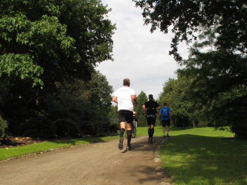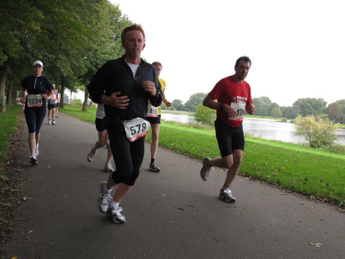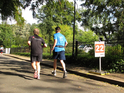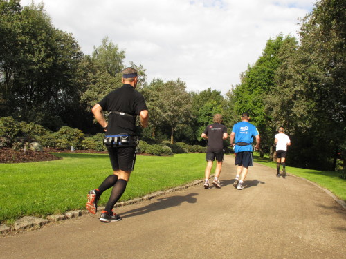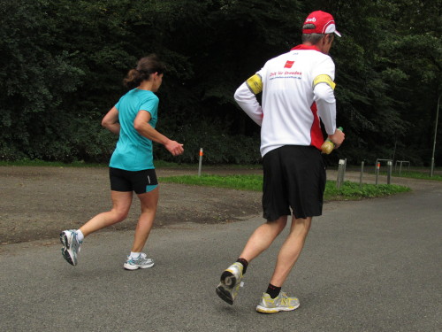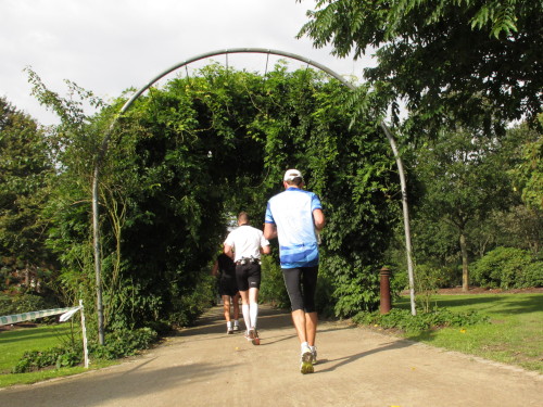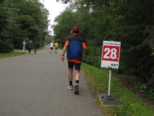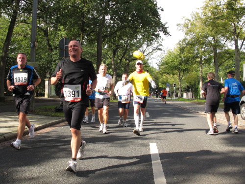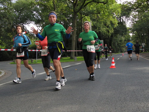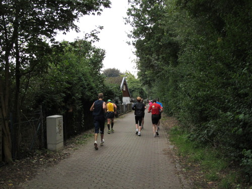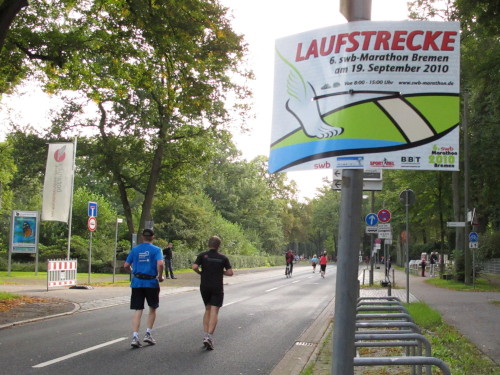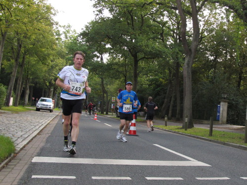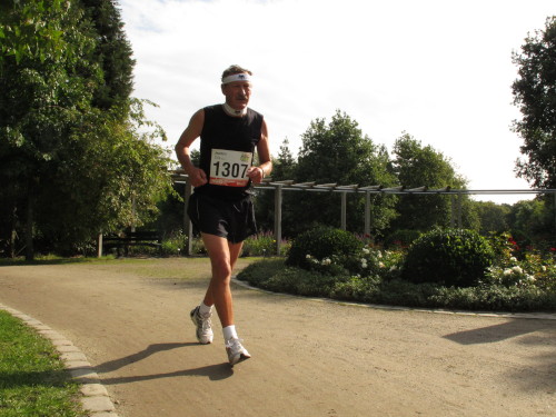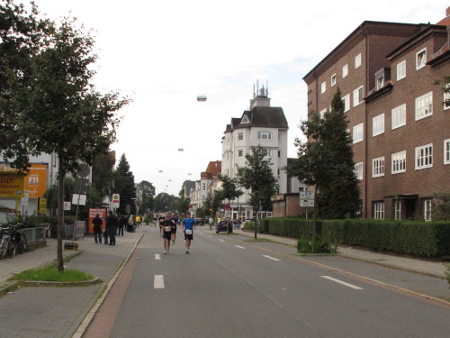 „Möchtest Du nicht gerne hier wohnen?“, frage ich einen Mitstreiter. „Gerne, aber ich fürchte, ich kann es mir nicht leisten.“ So sehe ich das auch. Die Marcusallee (km 20) im Ortsteil Horn ist eine der besten Bremer Adressen. Ärzte und Anwälte, Stiftungen und wohlhabende Bürger residieren hier in prachtvolle Villen, den Golfplatz gleich vor der Tür, ebenso den Botanischen Garten mit dem Rhododendronpark, den wir gleich noch kennenlernen. Zuvor nehmen wir bei der Halbdistanz die Zwischenzeit (Jahresbestzeit für mich!) und tarieren die 42,195 km ganz genau auf einer kurzen Wendepunktstrecke aus. Maximal so 3 Minuten liege ich vor dem 4:30-Pacer, stelle ich bei der Gelegenheit fest. Irgendwann hat er mich.