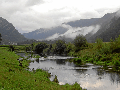 Mit fünf Minuten Verspätung wurde der Lauf um 7.20 Uhr gestartet. Défi und Marathon starteten gemeinsam und trennten sich nach 28 Kilometern. Erst liefen wir eine halbe Runde im Stadion, bevor es dann hinaus auf die Strecke ging. Couvet liegt in einem breiten Tal, durch das sich das Flüsschen L’Areuse schlängelt. Die ersten 10 Kilometer liefen wir im Tal flussabwärts, so dass dieser Streckenteil zum „Einrollen“ geradezu ideal war. Ich joggte zusammen mit Klaus und Alexander in gemütlichem Tempo, wir freuten uns, dass es so mühelos lief, philosophierten über die Läufer, die nach der Uhr liefen und über die, die nur nach Gefühl liefen und wunderten uns, dass wir die ersten fünf Kilometer so unglaublich langsam waren (7:06 min/km) und auf den zweiten so schnell (5:03 min/km). Da stimmten offensichtlich die beiden ersten Kilometerangaben 5 km und 10 km überhaupt nicht.
