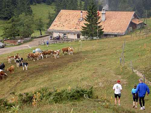 Noch etwa zehn Minuten ging es sanft hoch und über den Soliat (1485m), bis wir dann wieder abwärts geführt wurden, ein paar hundert Meter über Kuhweiden, immer wieder musste ein Gatter überwunden werden, bis wir dann an der Kontrollstelle waren, an der unsere Startnummern notiert wurden. Danach „verloren“ wir auf den nächsten etwa 10 Kilometern wieder die zuvor erarbeiteten knapp 800 Höhenmeter.
