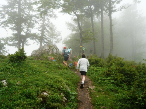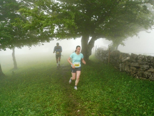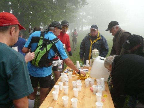 Irgendwann wird die Forststraße zum Pfad, in welchem der Anteil an Wurzeln und Matsch laufend zunimmt. In den Lichtungen kommt wenigstens etwas von dem trüben Morgenlicht zu uns herunter, der Blick ins Tal ist aber nicht richtig freigegeben. Zu schwer hängt die Feuchtigkeit der vergangenen Regentage in der Luft. Beim Erreichen der Krete des Creux du Van verlassen wir den Wald und werden von ein paar Zuschauern empfangen, deren Silhouette sich dunkel vor dem dichten Nebel abzeichnet. Hier sehen wir was passiert, wenn Wasser zum klaren Absinth gegossen wird: Im Glas entsteht ein milchiges Weiß. Zum Trinken gibt es hier aber das ungefährliche, reichhaltige Angebot. Der Boden dafür kann mit Früchten, Riegeln, Schokolade, Keksen und Crackers gelegt werden.