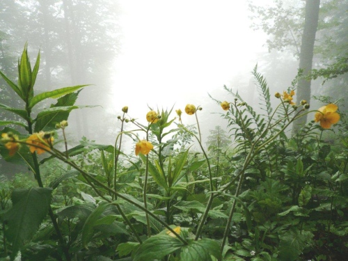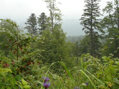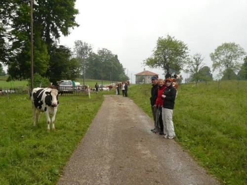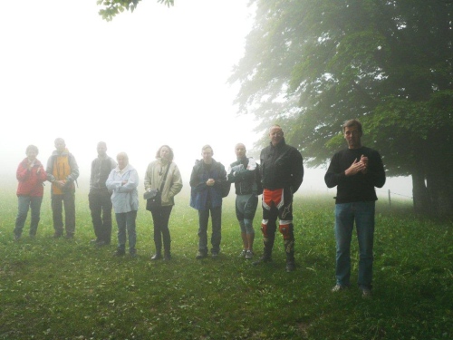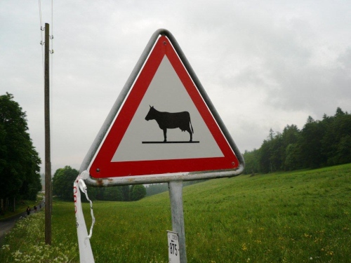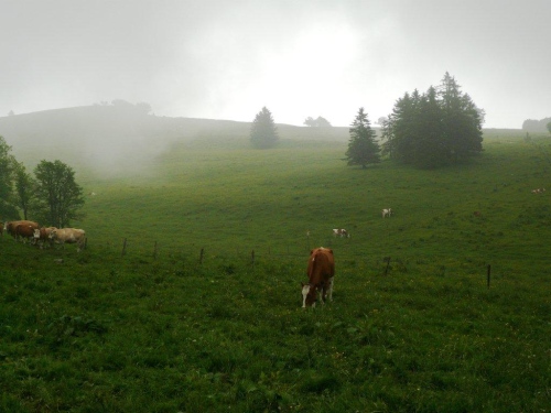 Auf den folgenden Kilometern ist die Strecke ein Wechsel von Graspfaden über Weiden und Wirtschaftsstraßen, ein Teil davon sogar befestigt. Die Nebelstimmung ist traumhaft, die Schwaden huschen Feen gleich über die mit Regen gesättigten Weiden. Und immer wieder stehen Kühe in stoischer Ruhe inmitten dieser Szenerie, als würden sie kein anderes Wetter kennen.