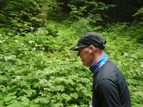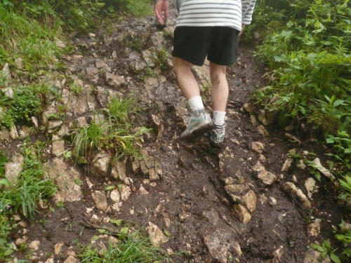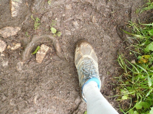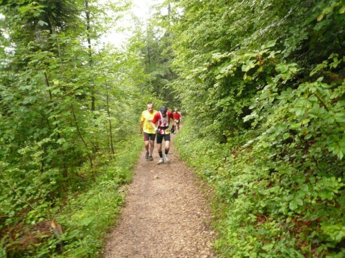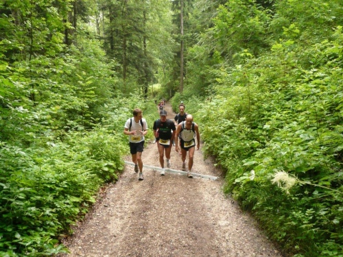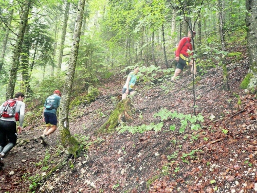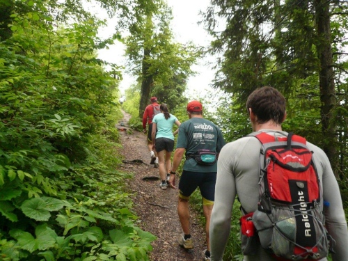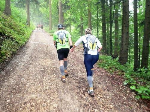 Nach 21 Kilometern kommt bereits die vierte Verpflegung und anschließend ein halber, flacher und geteerter Kilometer, auf welchem noch Zeit zum Herunterschlucken bleibt. Nachher wird leer geschluckt, wenn man die Strecke nicht schon kennt. Denn jetzt geht es auf richtig schlammigem Waldboden in eine Richtung: abwärts, und das nicht zu wenig. Mit der Zeit gibt es weniger Schlamm, dafür mehr Wurzeln und rutschige Steine, dazwischen auch ein paar Treppenstufen aus Rundbalken oder Stein. Das alles fährt zünftig in die Oberschenkel, welche noch ohne Murren mitmachen.