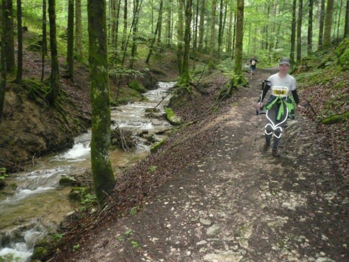 Das schäumen des Wasserfalls erscheint im Kontrast zum dunklen Wald fast unwirklich hell. Am Waldrand überquere ich – von einer Zuschauerin gewarnt – mit äußerster Vorsicht eine kleine Holzbrücke. Bisher dachte ich, nur mit einer Überdosis Schmierseife eingeseifte Stege in Trickfilmen könnten einen solchen Untergrund abgeben. Stimmt nicht, dieser Versuch zeigt, dass es auch in Natura geht. Kurz hinter der Brücke vernehme ich schon die Klänge einer Guggenmusik; der nächste Verpflegungsposten bei Môtiers liegt also schon ganz nah.
