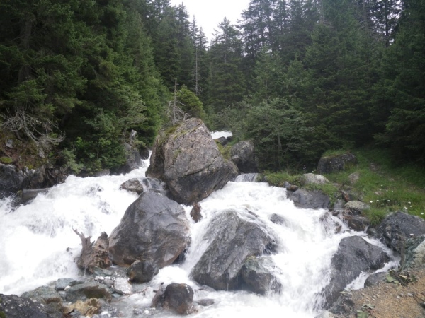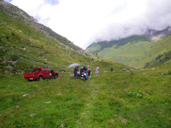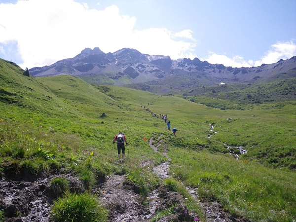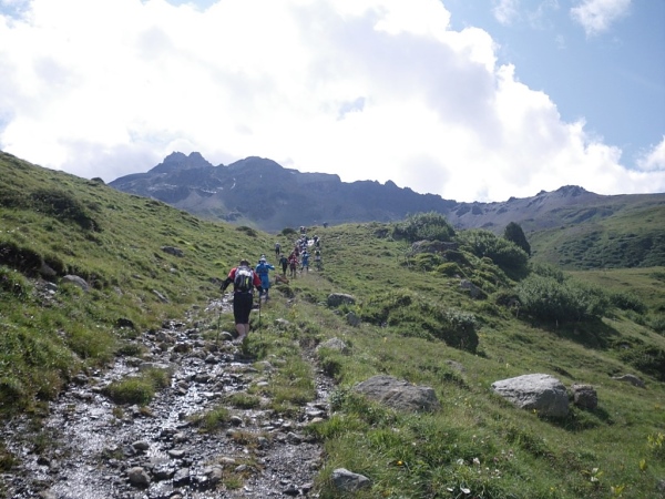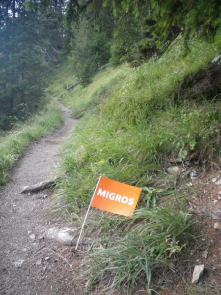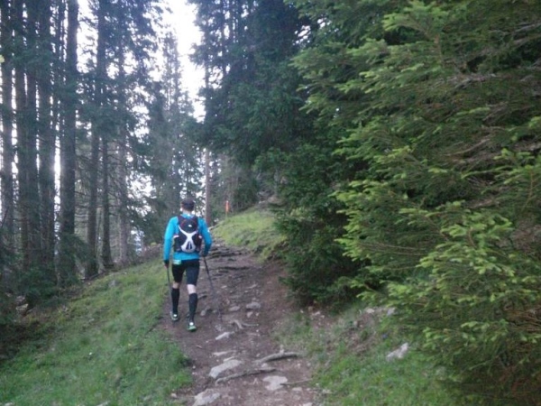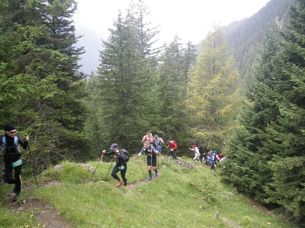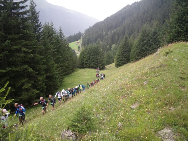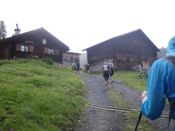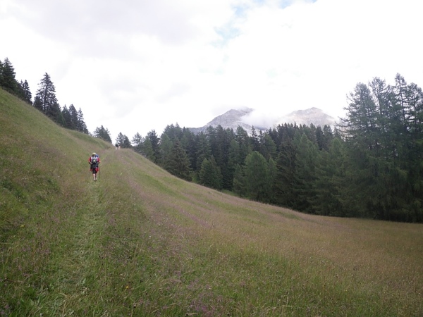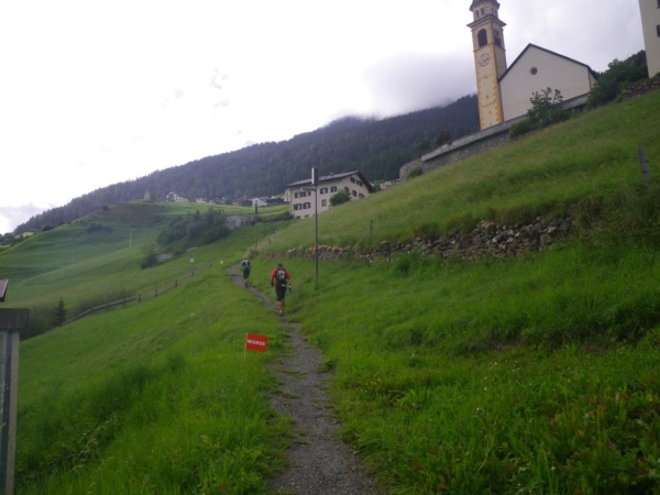 Nach etwa 11 Kilometern hatten wir die Passhöhe Furschela da Colm (2399 m) überwunden und folgten einem steilen, steinigen Pfad hinunter ins Val d´Err mit gleichnamiger VP (km 12/2130 m). Auf den 10 Kilometern zurück nach Savognin wechselten breite Schotterwege und wunderschön zu laufende Wald- und Wiesenpfade ab. Auf diesem Stück konnten wir uns richtig gut einlaufen. Allerdings hatte sich das anfangs angenehme sonnige Wetter vom Morgen deutlich verschlechtert, dunkle Wolken machten sich im Tal breit, die sich dann auch ergiebig ausregneten. Wir waren wieder einmal gezwungen, unsere Regenjacken herauszuholen, um nicht völlig zu durchnässen. Die VP Savognin (km 23/1173 m/Zeitlimit Sa 5:55 Uhr) war ein großer Verpflegungsposten, den auch die Läufer der längeren Distanzen passierten. Z.B. hatten die T201-Läufer in Savognin bereits 137 Kilometer zurückgelegt und diejenigen, die den T141 liefen, trafen nach 80 Kilometern beim Verpflegungsposten ein.