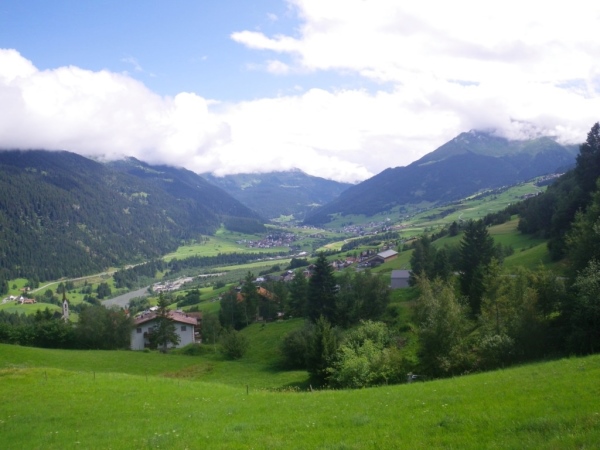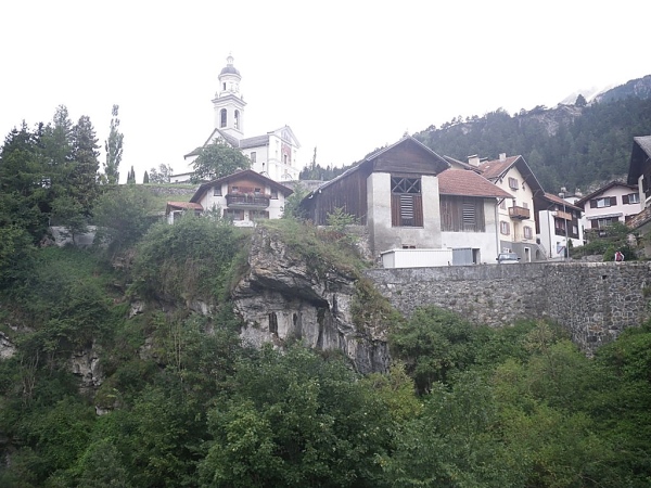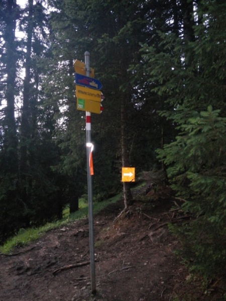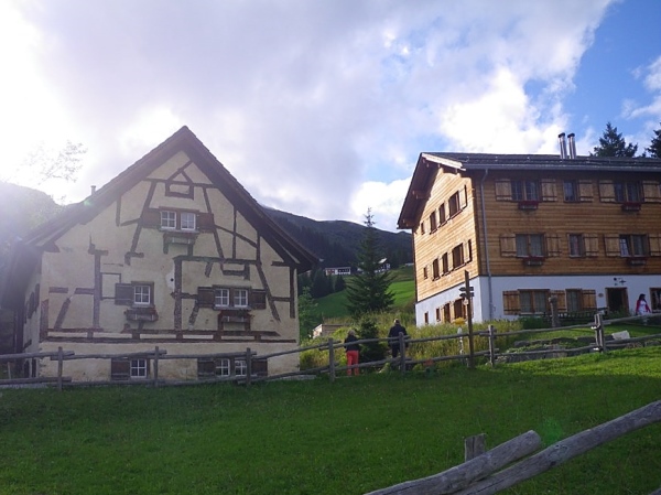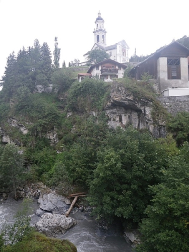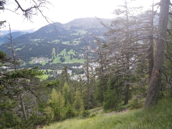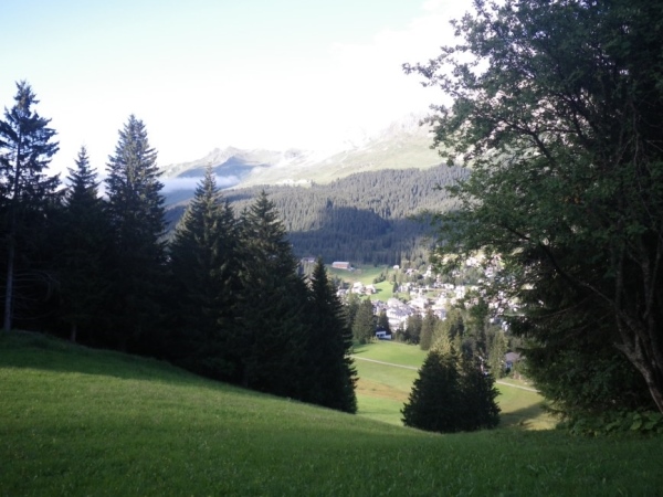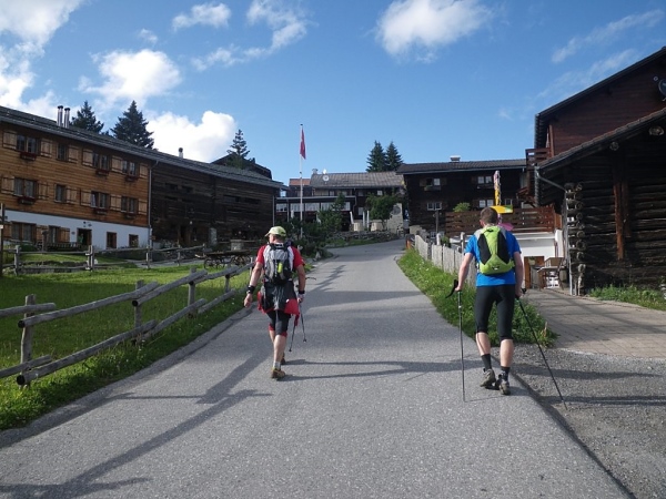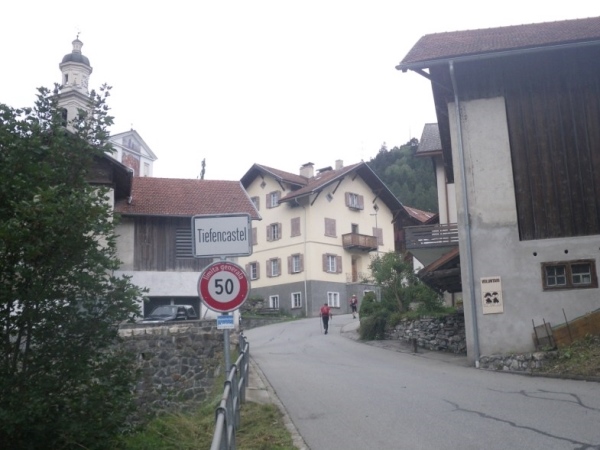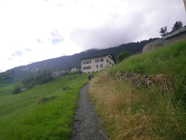 Tiefencastel (km 34) ist mit 851 m auch der tiefste Punkt. Der Ort selbst liegt an einem Knotenpunkt auf dem Weg von Thusis kommend nach Lenzerheide, nach Bergün, nach Davos und nach St. Moritz. Neben den ausgebauten Straßen sahen wir auch die Bahntrasse der Rhätischen Bahn, die ebenfalls ihre Strecken in diese Gegend unterhält. So war es nicht verwunderlich, dass wir uns nicht ganz so einsam fühlten, wie auf unserem ersten Abschnitt im Parc Ela. Einen Vorteil hat so ein Streckenabschnitt auf breiten Wegen: Man kommt schneller voran, als geplant. Es war größtenteils nicht sehr steil, so dass wir fast alles laufen konnten. Durch Alvaschein, Zorten, Lain und Sporz gewannen wir allmählich wieder an Höhenmeter, um hinüber in das Hochtal von Lenzerheide zu gelangen.
