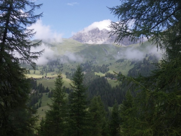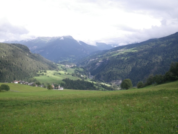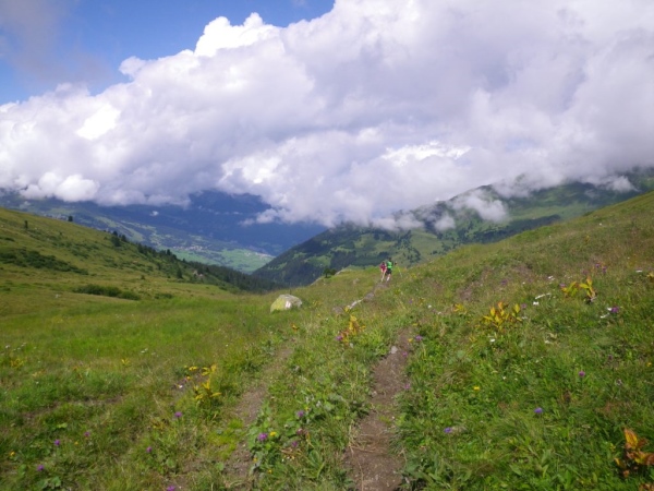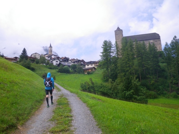 Die Strecke zwischen Savognin über Tiefencastel bis Lenzerheide war landschaftlich nicht so reizvoll wie der Abschnitt zuvor. Auch waren die Wege über viele Kilometer entweder auf Asphalt oder breiten Wirtschaftwegen. Doch so konnten wir noch einmal die Aussicht zurück auf die Berge im Parc Ela und in die tiefen Täler zwischen Albula und Julier genießen. Auf den grünen Hängen streiften wir kleine Dörfer wie Riom, Salouf, Del und Mon, bis wir dann in Tiefencastel unsere nächste VP erreichten.