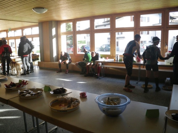 Bald hatten wir mitten im Ort in der Sporthalle die nächste Verpflegungststelle Lenzerheide (km 49/1473 m/Zeitlimit Sa 14:35 Uhr) erreicht. Die Sonne stand bereits tief und ein kalter Wind blies uns ins Gesicht. So nutzten wir die Gelegenheit und zogen uns schon mal wärmere Sachen über, um für die kühleren Temperaturen des zu Ende gehenden Tages gerüstet zu sein.