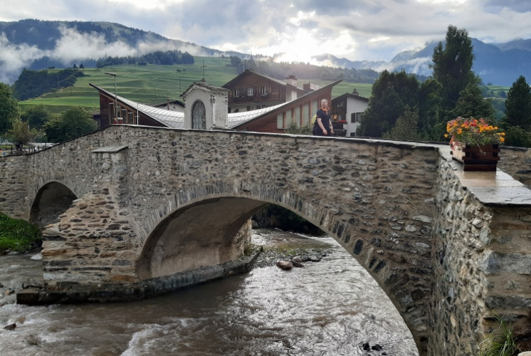 Ansonsten ist das Ankommen im bergnaturumrahmten Savognin am Freitagnachmittag überaus entspannt. Mit seinen etwa eintausend Einwohnern ist das auf 1.207 m üNN beiderseits des Flüsschens Julia gelegene Savognin ein hübsches und gemütliches Bündner Dorf mit langer Geschichte. Gleich drei barocke Kirchen aus dem 17. Jahrhundert bezeugen, dass das alte Dorf aus mehreren Kernen entstanden ist. Verbunden werden die Ortsteile unter anderem durch die seit 1682 über die Julia führende Steinbogenbrücke Punt Crap. Gesprochen wird hier noch das rätoromanische Idiom Surmiran. Spannend zu lesen, aber kaum zu verstehen sind für mich die Straßennamen und Gebäudeaufschriften. Seine gemeindliche Eigenständigkeit hat Savognin allerdings 2016 verloren und ist seitdem Teil der aus mehreren Dörfern der Region gebildeten Gemeinde Surses, immerhin die flächenmäßig drittgrößte der Schweiz.