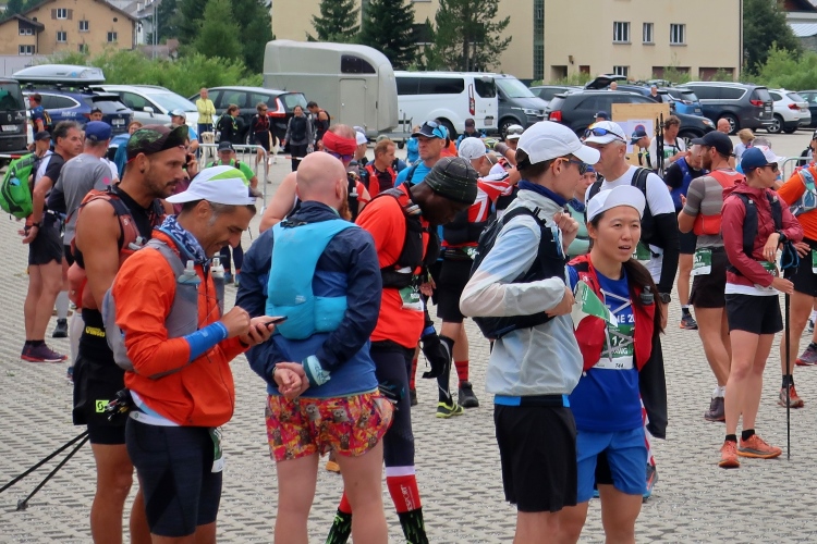 Am Ortseingang von Mulegns erwartet uns die erste Verpflegungsstation. Ich genieße den Moment der Ruhe, ohne Laufrucksack auf dem Rücken. Um 14:30 Uhr schlägt hier das Zeitlimit zu, aber das muss niemand schrecken. Ein wenig Muße sollte man sich gönnen, denn 1.200 Meter Anstieg stehen uns auf den nächsten zehn Kilometern bevor.