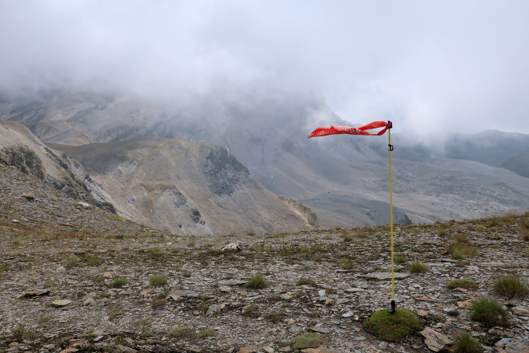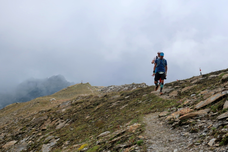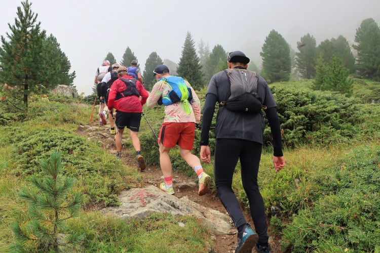 In einer Senke wird die Sicht kurzzeitig etwas klarer, aber schon weiter vorn und oben verliert sich die Läuferschlange wieder im Wolkennebel. Nach etwa fünf Kilometern erreichen wir den mit 2.255 m üNN höchsten Punkt des ersten Streckenabschnitts. Herrlich soll die Aussicht sein, die man beim Weg über den Kanonensattel (2.214 m üNN) genießen kann, doch dieser Lohn der Mühen bleibt uns heute verwehrt und so dürfen wir uns sogleich dem steilen Abstieg widmen.