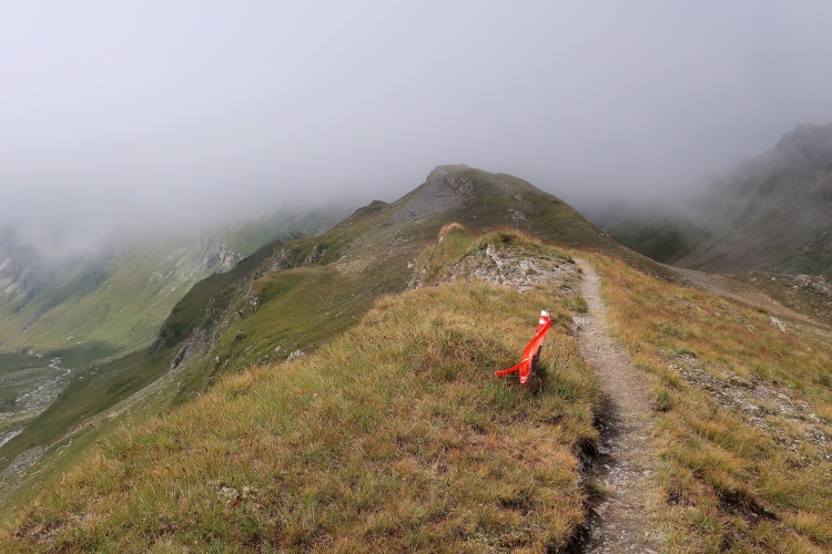 Hinab führt der Pfad in Richtung Alp Flix, einer Hochebene auf knapp 2.000 m üNN, in der sich durch stehende Gewässer eine Moorlandschaft gebildet hat. Sichtkontakt zur Alp bekommen wir aber erst, als wir die Wolkendecke durchbrechen und sie schon fast erreicht haben.