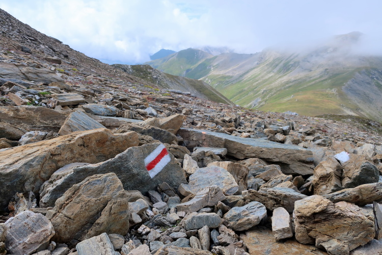 Eine steinige Mondlandschaft gilt es jenseits der Passhöhe zu queren. Die Wildheit der Bergwelt wird durch die Wolkenfetzen verstärkt, die zwischen den schroffen Gipfelregionen herumziehen und immer neue faszinierende Bilder entstehen lassen. Durch schieferigen Schotter führt mich der Pfad steil hinab in die Tiefe, bis zu einer kleinen grünen Anhöhe mit zwei einsamen Tümpeln.