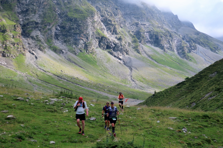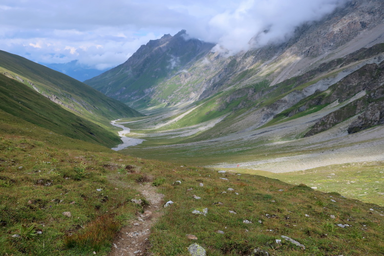 Ein kurzzeitig steiler und steiniger Pfad bringt mich schließlich höher hinauf in das sich verengende Tal. Durch die grünen Almwiesen schlängelt sich der holprige Weg nurmehr leicht, aber permanent ansteigend bis zum fernen Horizont dahin. Immer wieder sind kleine Bäche zu queren. Das Band der Läufer hat sich so weit auseinandergezogen, dass diese vor und auch hinter mir nur noch als kleine bunte Punkte wahrnehmbar sind. Ein Gefühl von Weltabgeschiedenheit vermittelt diese einsame Gegend. Kühler und windiger wird es und näher rückt die Wolkendecke über mir.