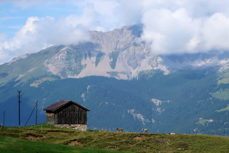 Fast ohne Unterlass geht es immer weiter hinauf, bis auf 2.154 m Höhe. Der Pfad mündet hier in eine fahrbare Schotterpiste, die als Höhenweg am Hang entlang mitten durch die Almwiesen zur Alp Somtgant und damit ins Skigebiet der Region führt. Einsame Masten der Liftanlagen zeigen, wo im Winter der Sportbetrieb tobt. Nach 33,3 km passiere ich die um diese Zeit verwaiste Bergstation der von Savognin herauf und sodann noch höher gen Piz Martegnas (2.661 m üNN) weiterführenden Bergbahn.