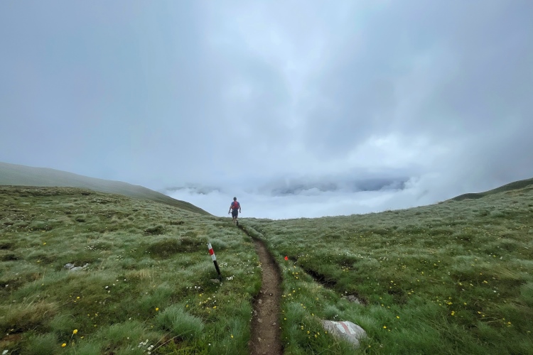 Nach einem kurzen Briefing geht es recht unspektakulär auf die Strecke. Es ist schon so hell, dass wir die Stirnlampe nicht brauchen. Zuerst durch den Ort und dann weiter über einen Fahrweg geht es moderat in die Höhe. Der erste Anstieg hat schon satte 1500 Höhenmeter. Still ziehen wir den Berg hoch. Zu Anfang haben wir noch den ein oder anderen Blick ins Tal. Dann verschwinden wir in den Wolken. Ab und zu Kuhglocken, aber die dazu passenden Tiere sehen wir nur selten. Zu dicht sind die Wolken. Der Fahrweg hat sich schon lange verabschiedet. Wir haben schnell die Baumgrenze erreicht. Schemenhaft ragen die ersten Felswände vor uns in den Himmel oder besser in die Wolken, denn vom Himmel sieht man nichts.